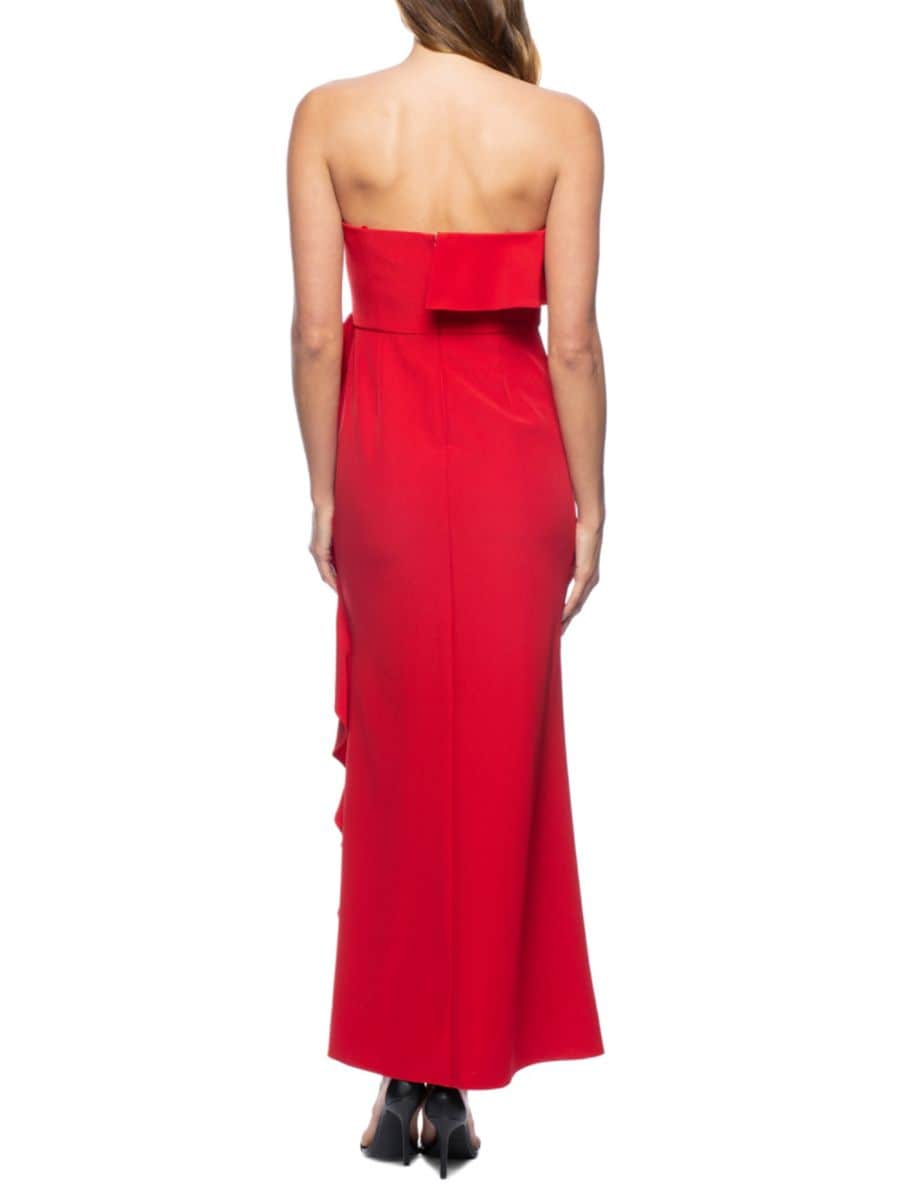 Это макси-платье с вырезом в форме сердечка и разрезом спереди украшено оборкой, что делает его шикарным, элегантным и смелым.