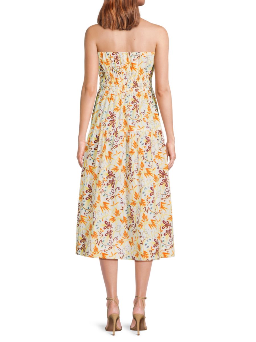 Шепчущая элегантность, хлопковое платье ALC Clark очаровывает своим ярким принтом, классическим вырезом бандо и очарованием без бретелек, которые прекрасно дополняются приталенной талией, создавая потрясающий А-силуэт.