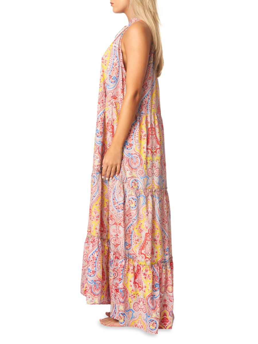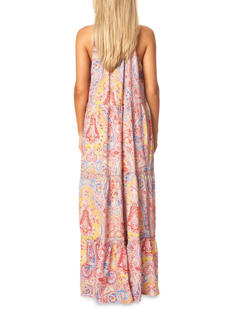 Это макси-платье с контрастными кисточками и многоуровневым силуэтом украшено узором пейсли по всей поверхности.