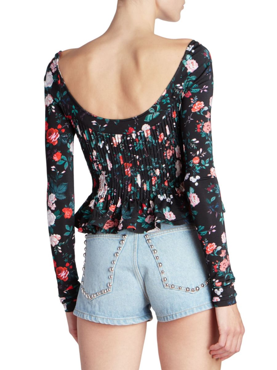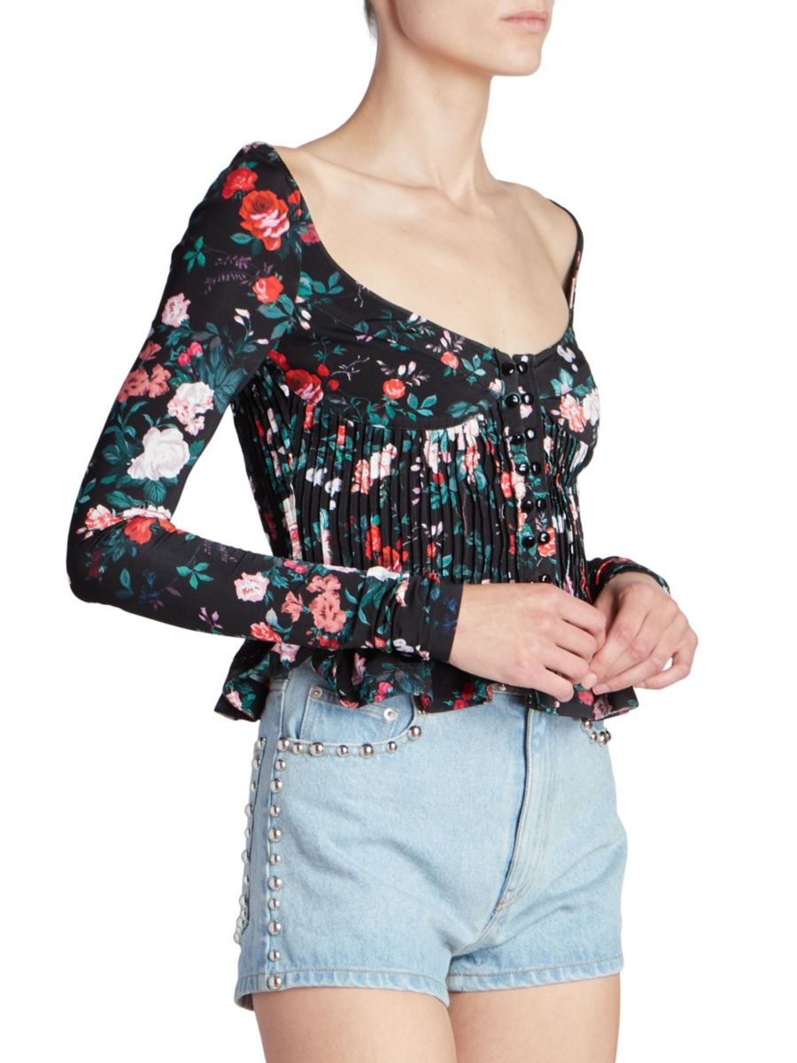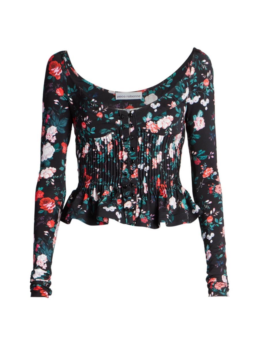 Цветочный топ Paco Rabanne отличается гармошкообразной плиссировкой на талии и эффектом баски.