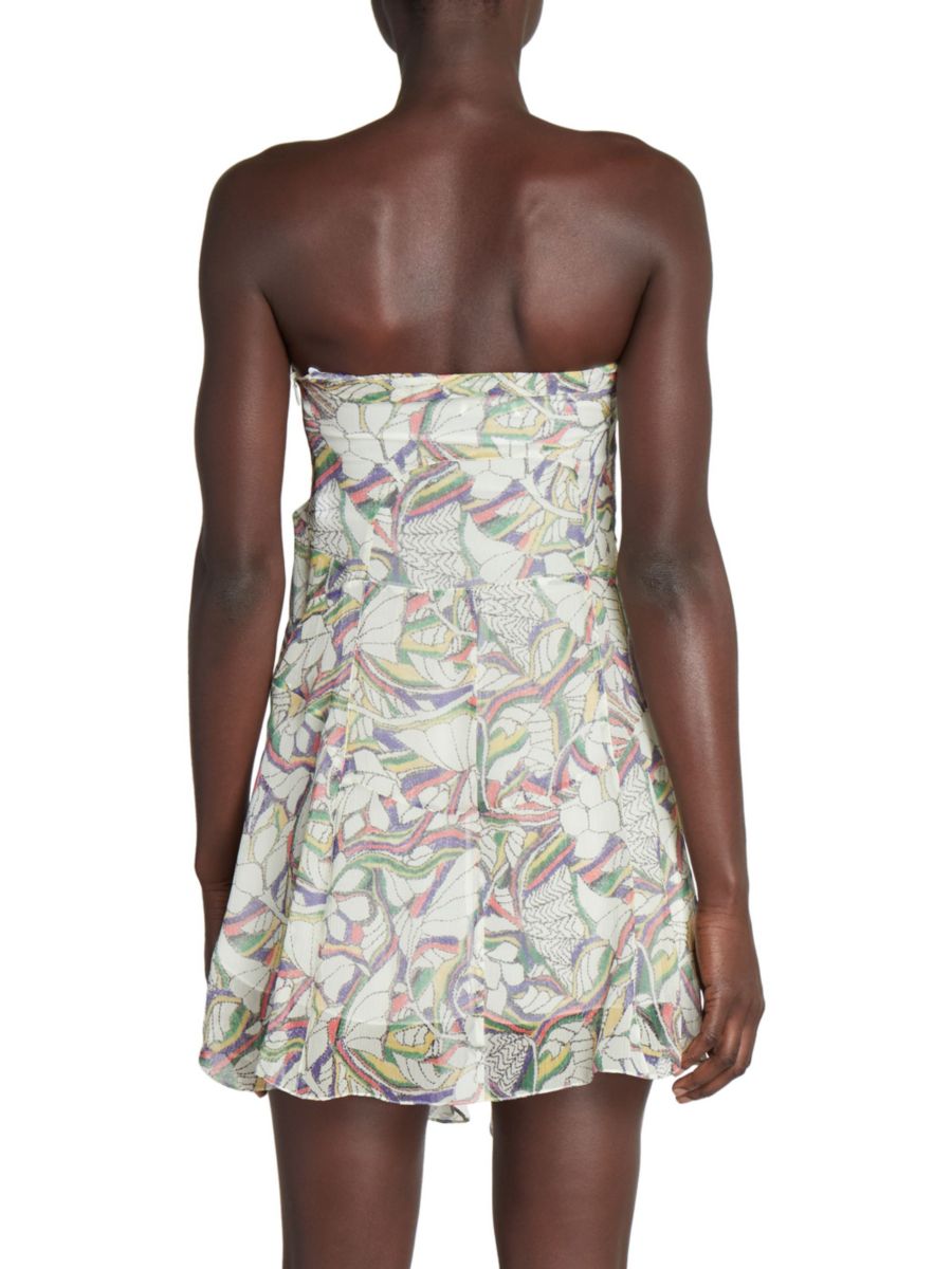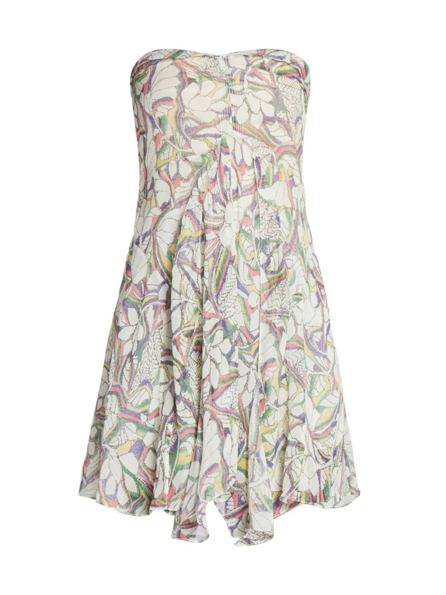 Это мини-платье из цветочного шелка имеет вырез в форме сердечка без бретелек и драпированный А-силуэт.