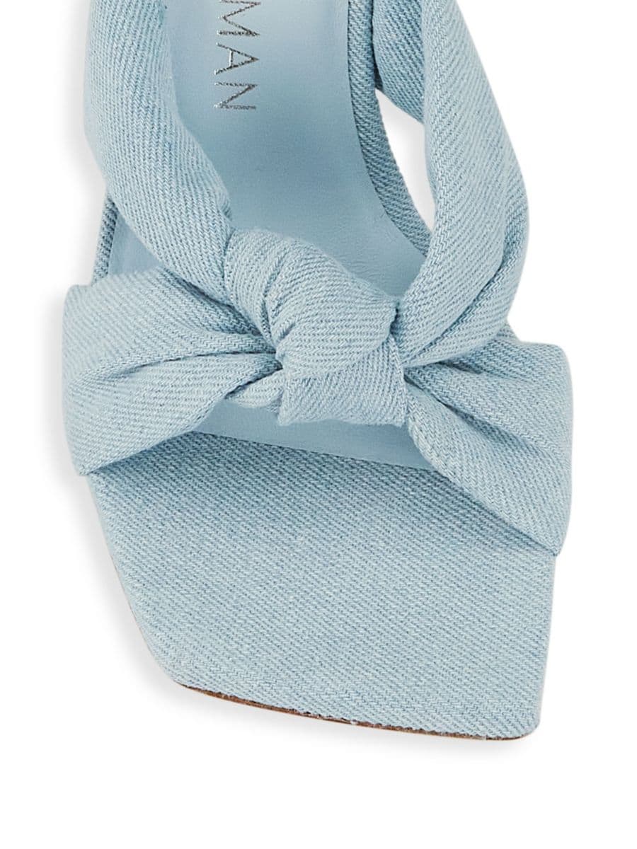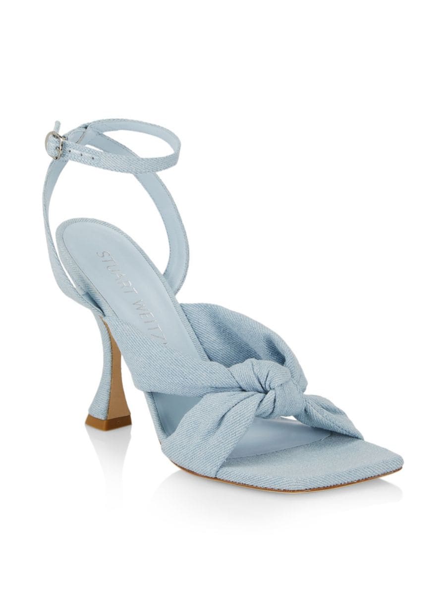 Эти босоножки с верхом из джинсовой ткани с узелком и ремешком на щиколотке. Изогнутый каблук-шпилька служит основой для модели с открытым носком.
