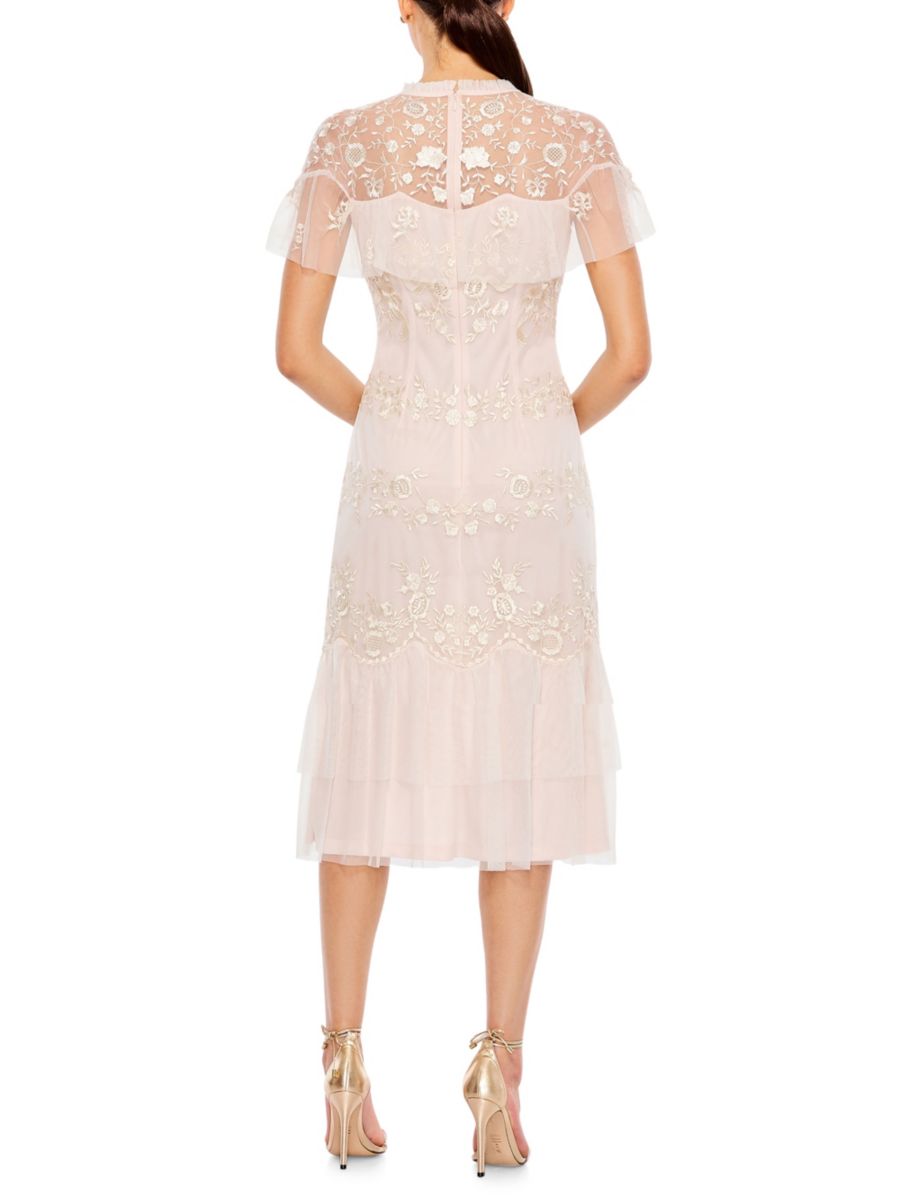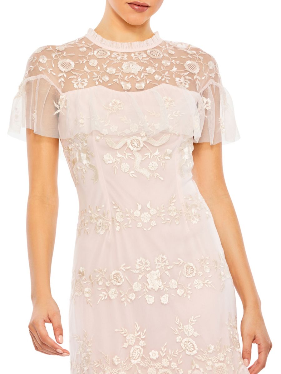 Цветочная вышивка придаёт объём этому сетчатому платью-футляру с короткими рукавами.