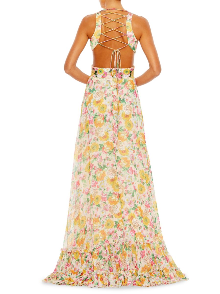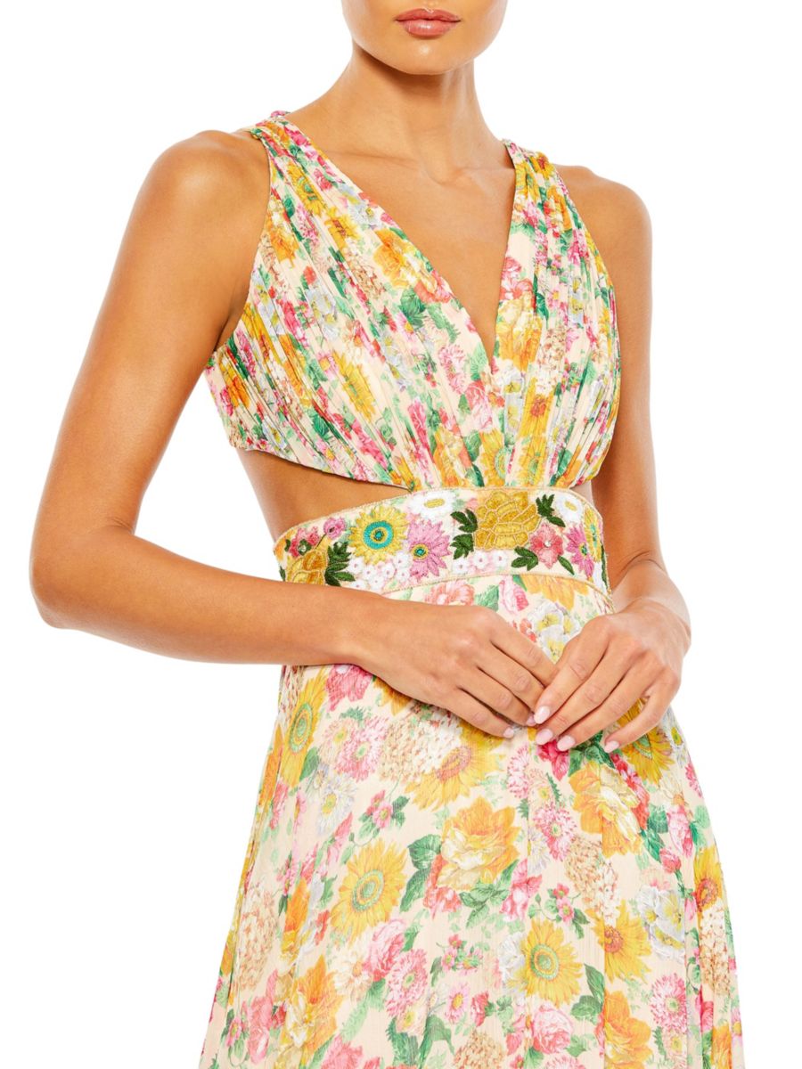 Платье А-силуэта с цветочным принтом и бисером Mac Duggal, цвет Nude Multi