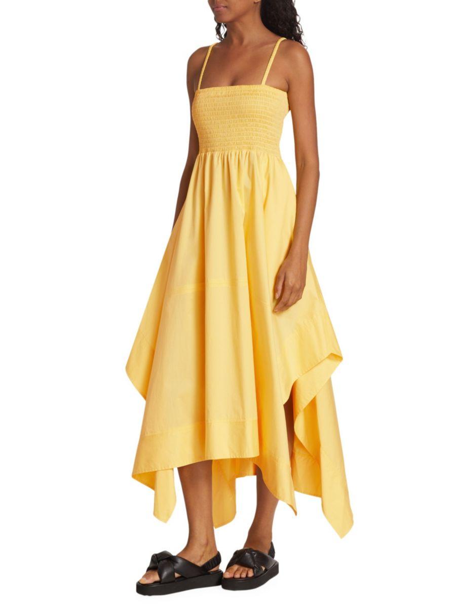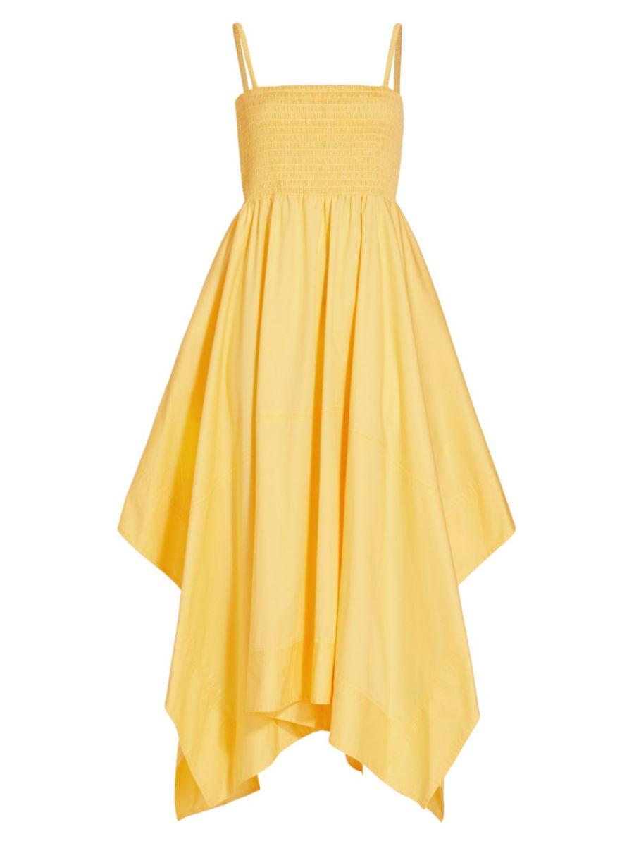 Платье Adriana от ALC выполнено из хлопка и имеет присборенный лиф, подол в виде платка и вырез сзади.