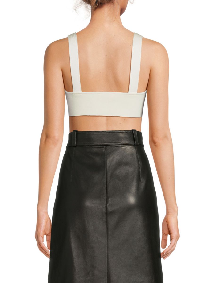 Этот бюстгальтер от McQueen изготовлен из шерстяной смеси с вырезом в форме сердечка и ребристыми бретельками, которые можно надевать через голову, обеспечивая комфортный и минималистичный вид.