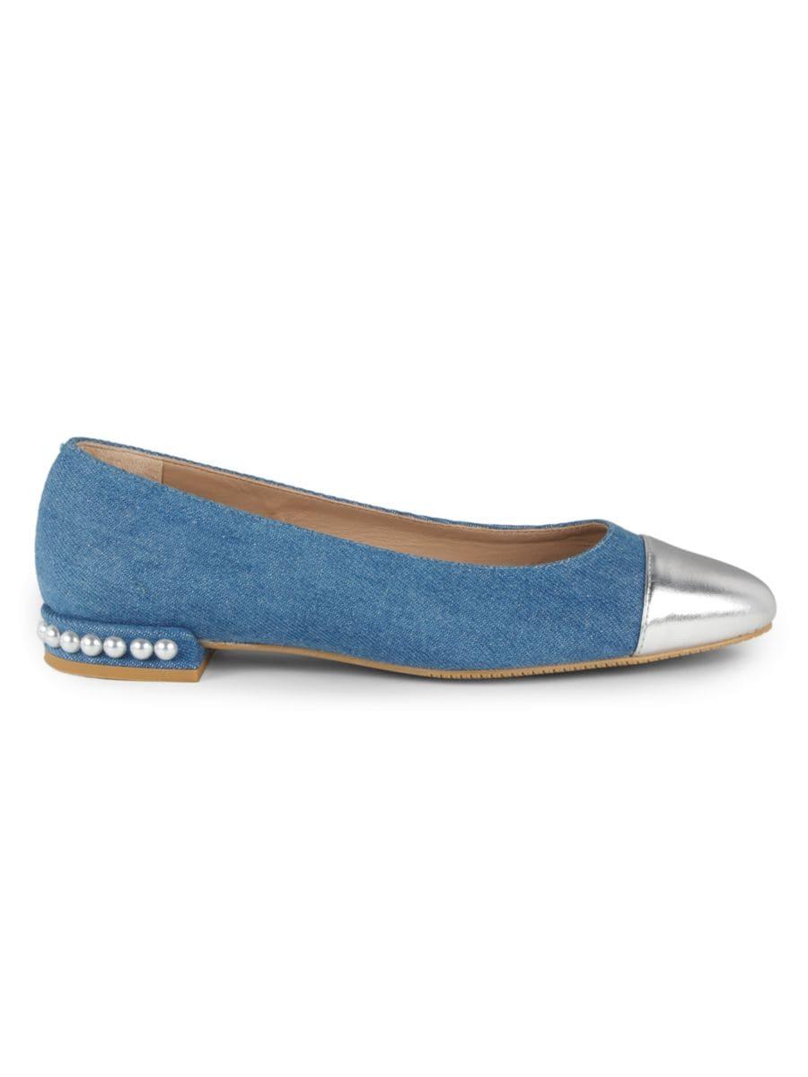 Искусственный жемчуг подчеркивает носок этих туфель-лоферов от Stuart Weitzman, выполненных из текстурированного денима с гладкой кожаной подкладкой.