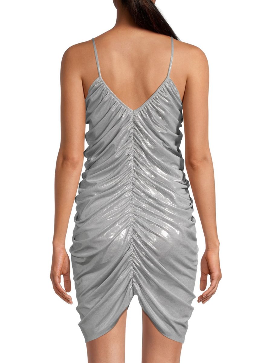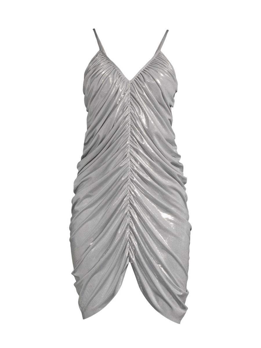 Мини-платье Diana от Norma Kamali выполнено из металлизированной ткани с V-образным вырезом и привлекательными сборками.