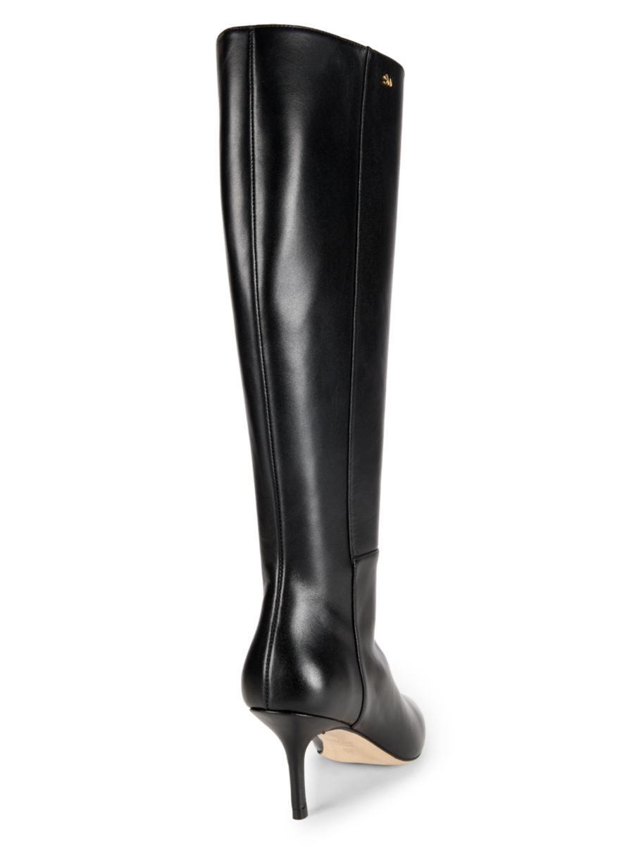 Эти сапоги выше колена от Stuart Weitzman изготовлены из гладкой кожи с острыми носами и низким каблуком, что придает им обтекаемый вид.
