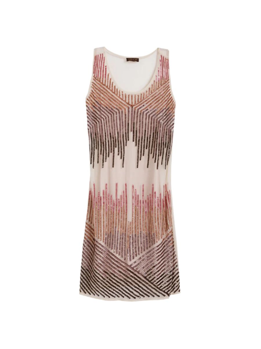 AS by DF представляет платье, привлекающее внимание мерцающими деталями и элегантным дизайном. Овальный вырез и регулируемые бретели подчеркивают силуэт, а пайетки, пришитые вручную, добавляют лёгкого блеска всему лифу.