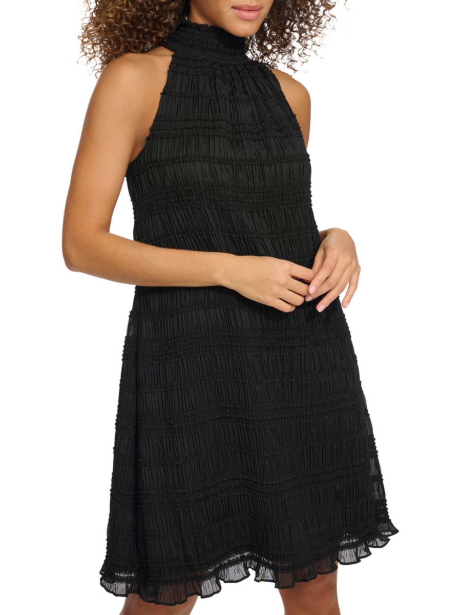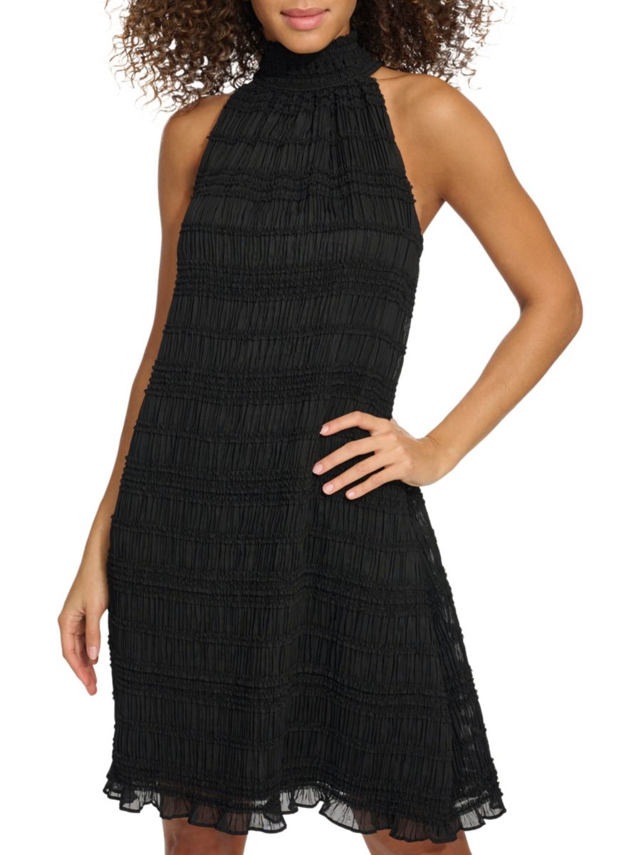 Мини-платье Kensie выполнено из гофрированной ткани с высоким вырезом.