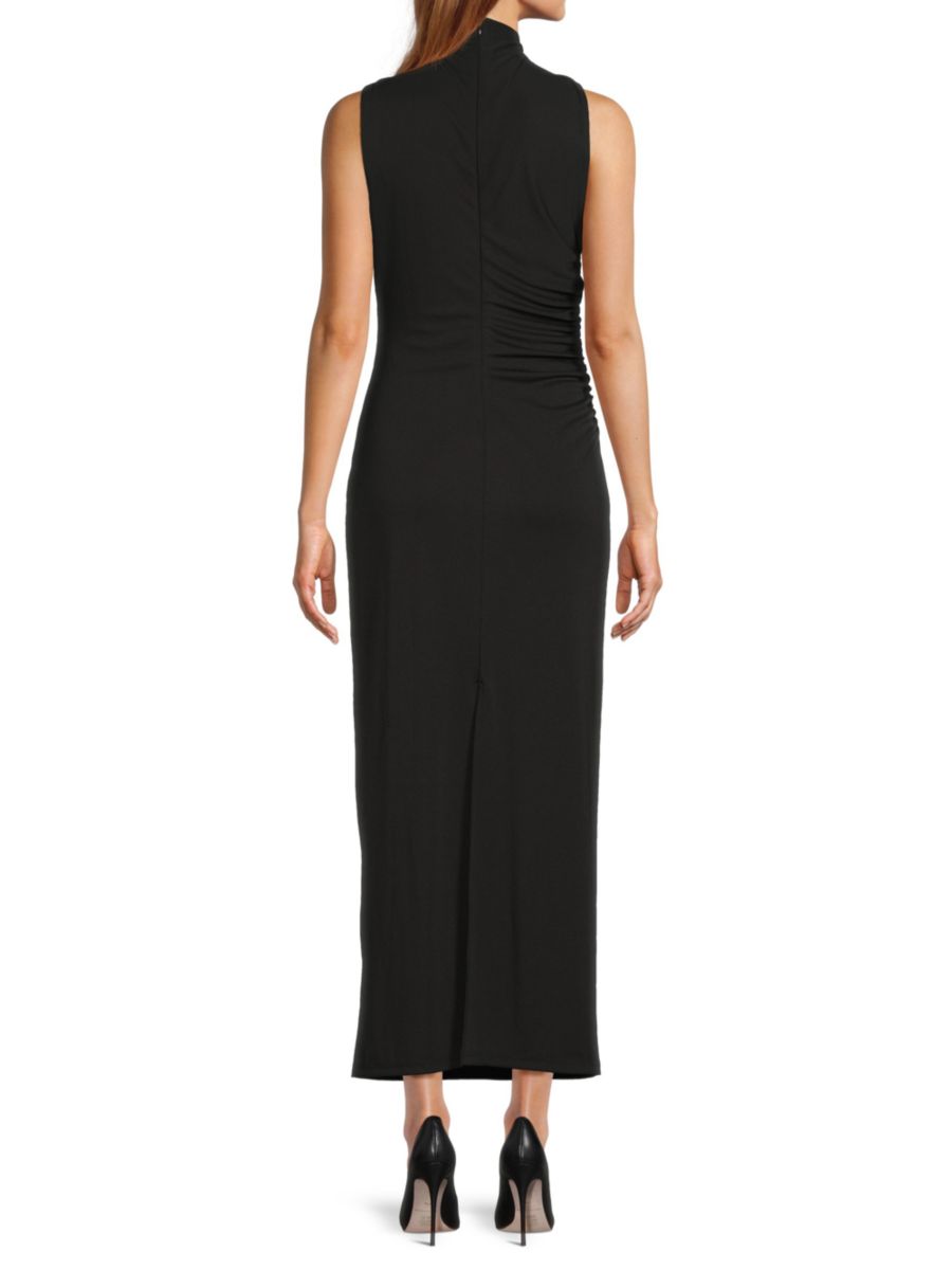 Это макси-платье от Area Stars из гладкого полиэстера выполнено с воротником-стойкой и без рукавов. Облегающий силуэт подчеркивается сборками и застежкой-молнией сзади.