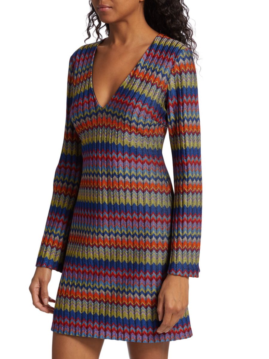 Мини-платье Maya от Ramy Brook имеет А-образный силуэт, выполненный из трикотажа с металлическим зигзагообразным узором в рубчик. Длинные расклешенные рукава подчеркивают образ.
