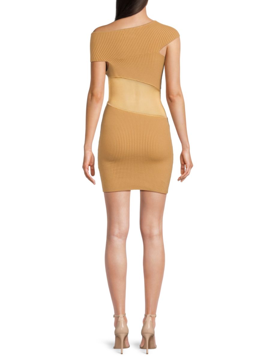 Мини-платье RTA имеет облегающий силуэт с асимметричным вырезом и коротким рукавом. Ребристая отделка подчеркивает полупрозрачную талию.