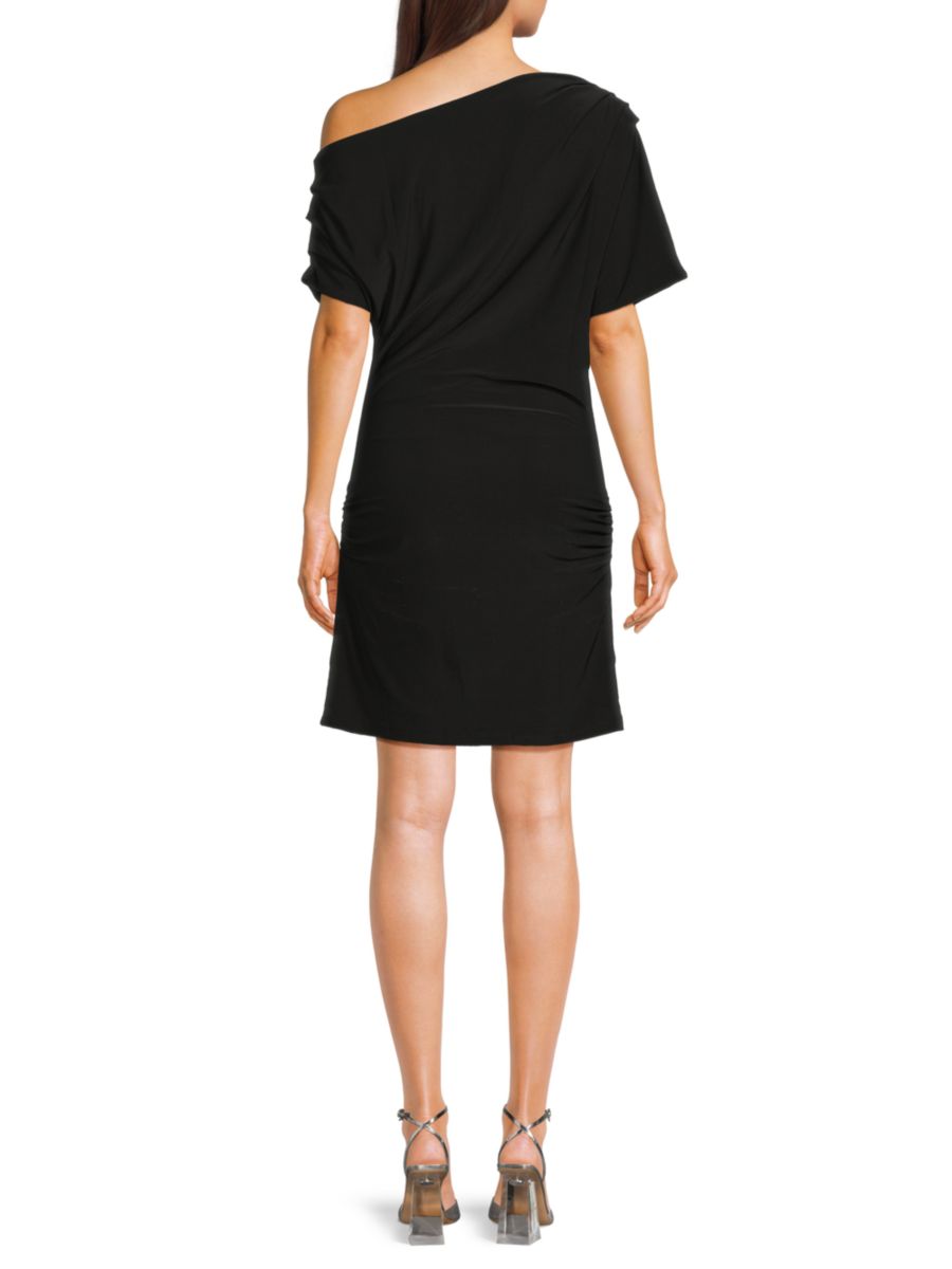 Мини-платье RTA с рюшами отличается эффектным вырезом на одно плечо, дополненным короткими рукавами для современного асимметричного образа.