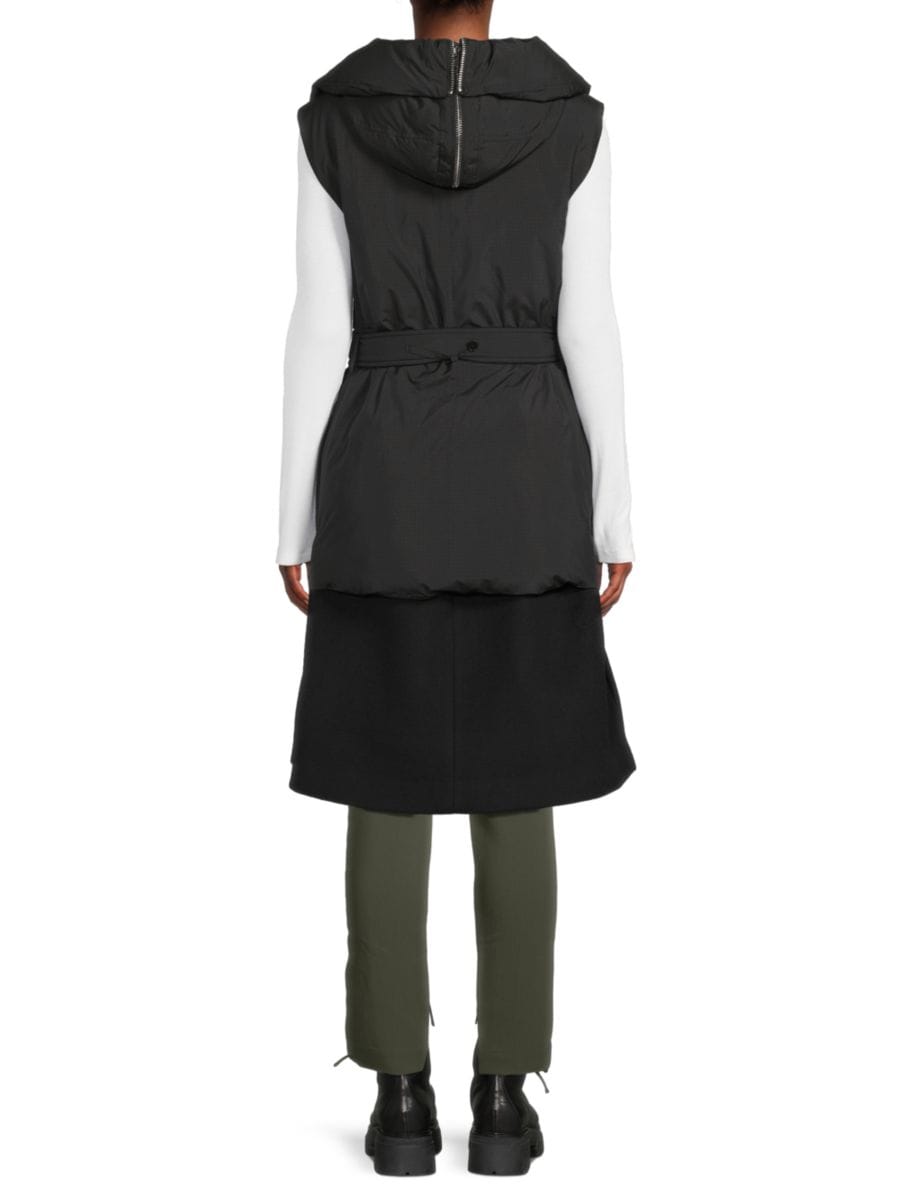 3.1 Phillip Lim предлагает современную интерпретацию классического стеганого жилета, представляя этот модный удлиненный крой. Благодаря пришитому капюшону на молнии и безрукавному силуэту, жилет отлично подходит для многослойного образа. Застежка на пуговицы спереди и пояс на талии добавляют элегантности, а два передних кармана обеспечивают практичность. Этот жилет, изготовленный из высококачественной ткани с роскошной подкладкой из купро и отделкой из шерсти и нейлона, сочетает в себе комфорт и изысканность. Идеально подходит для переходной погоды и легко преобразит любой наряд.