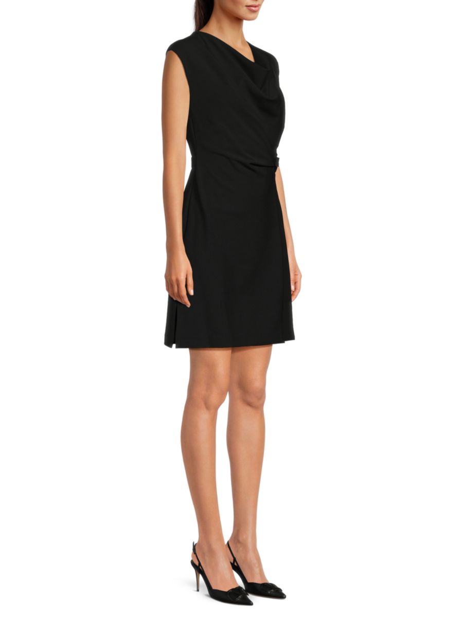 Это мини-платье DKNY с воротником-хомутом, имитацией запаха спереди и приталенным кроем. Платье выполнено из гладкой ткани с элегантной драпировкой.