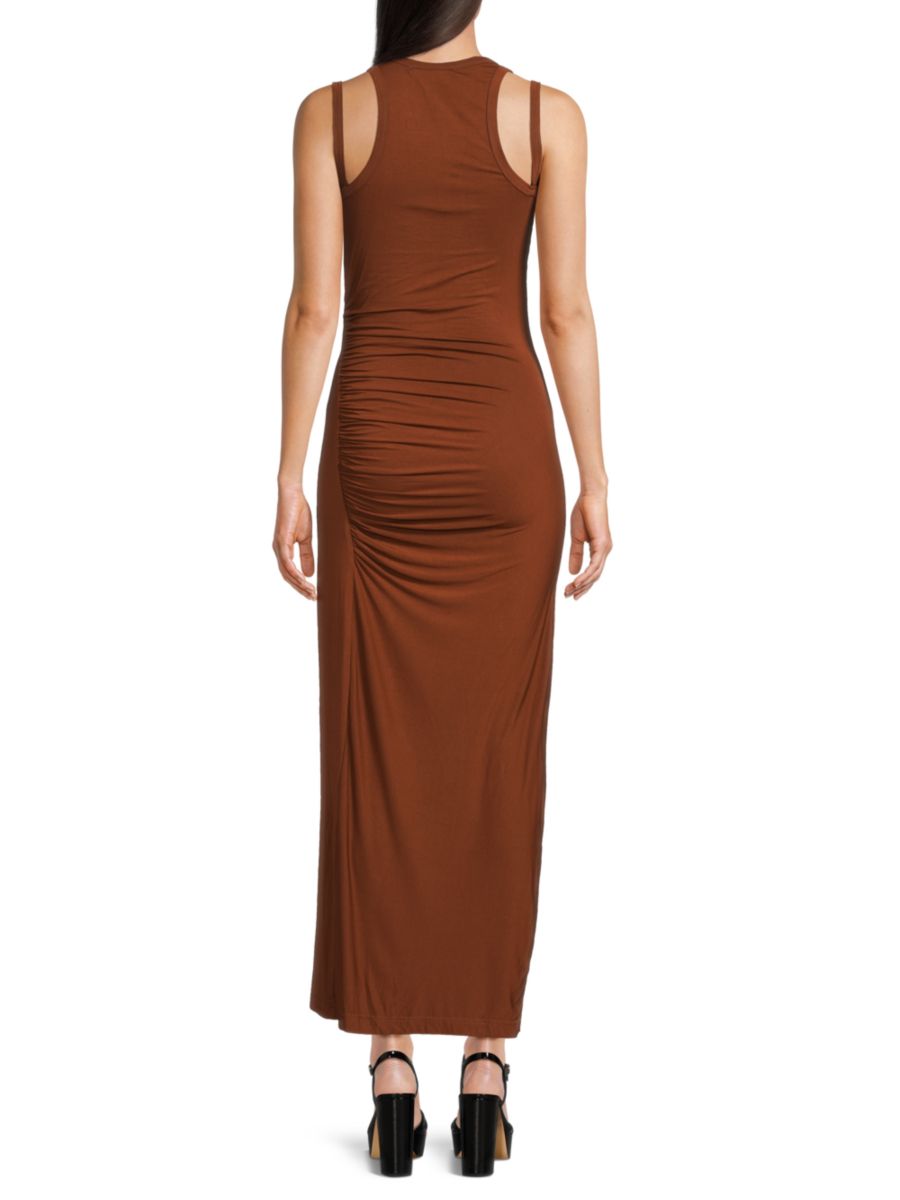 Это облегающее макси-платье с драпировками по всей длине обеспечивает удобную посадку и лёгкую эластичность для лёгких движений.
