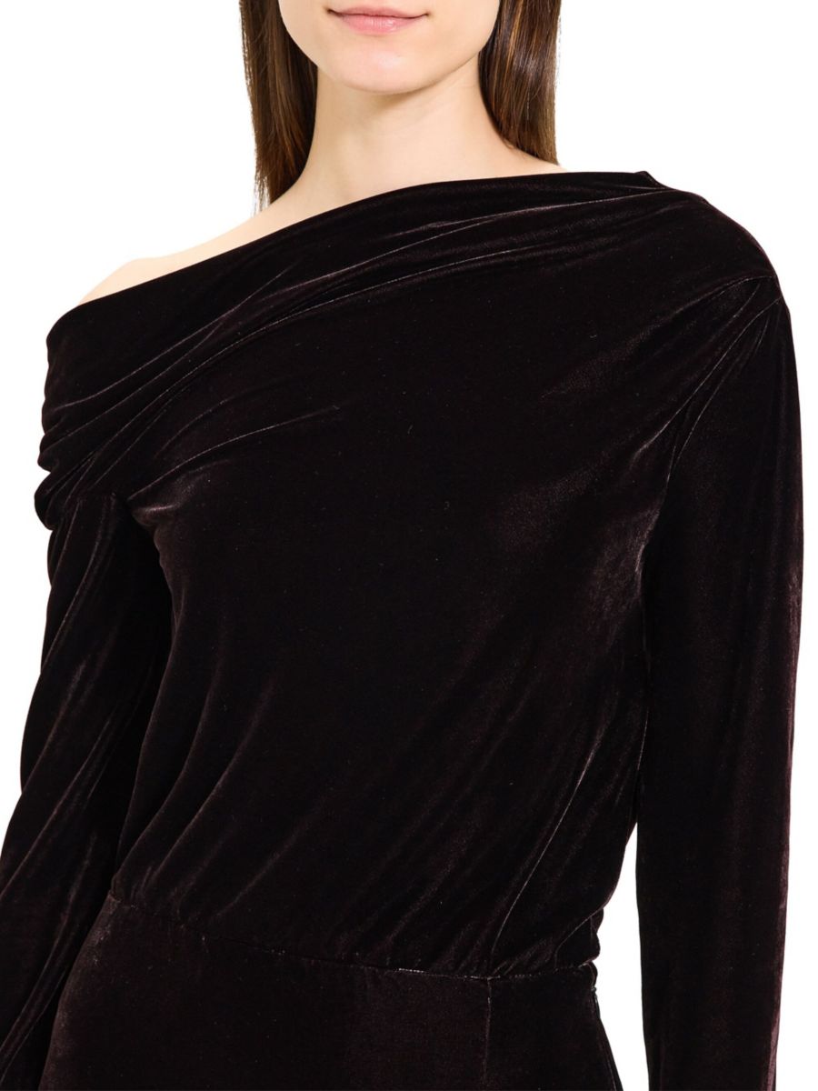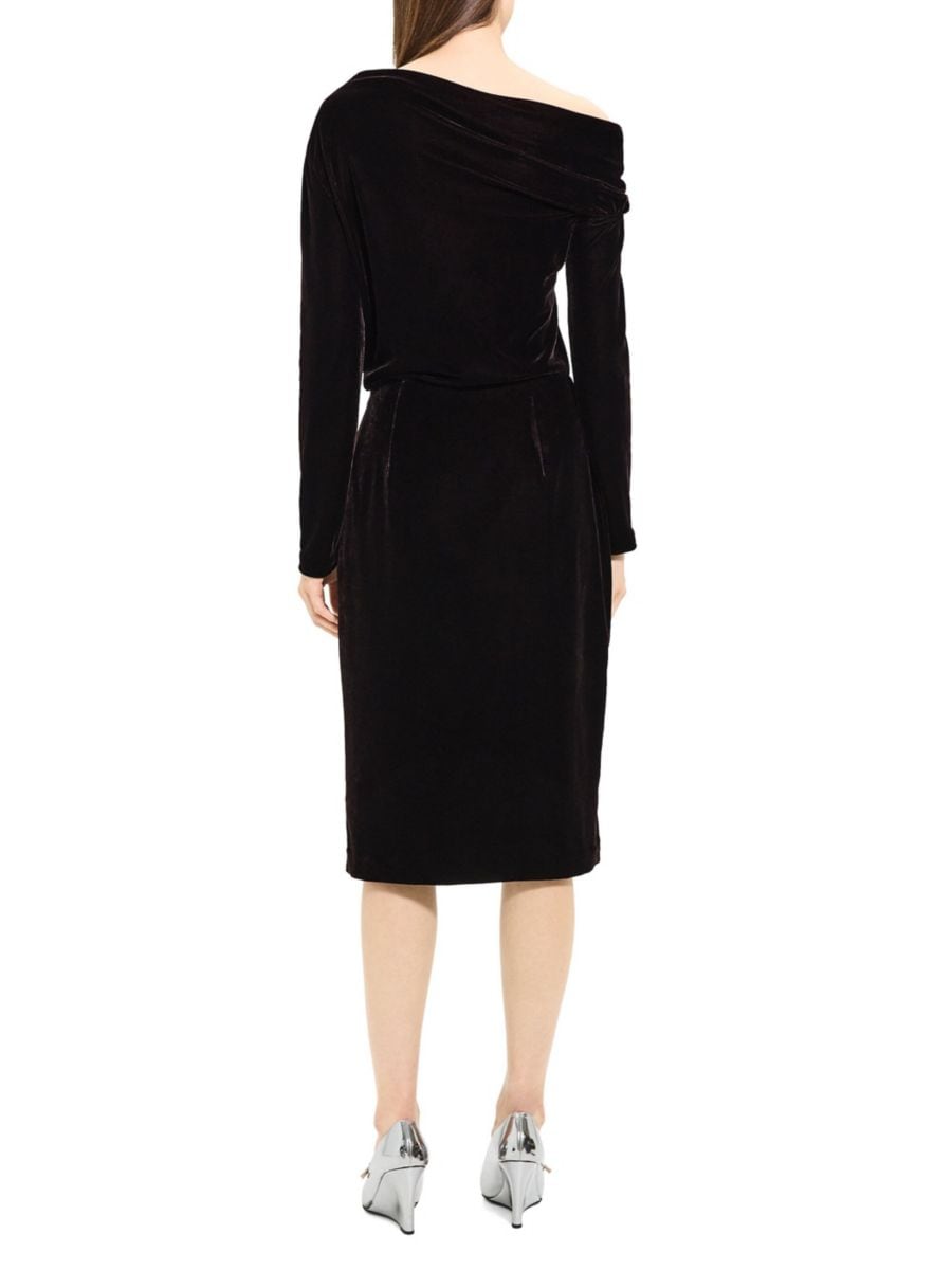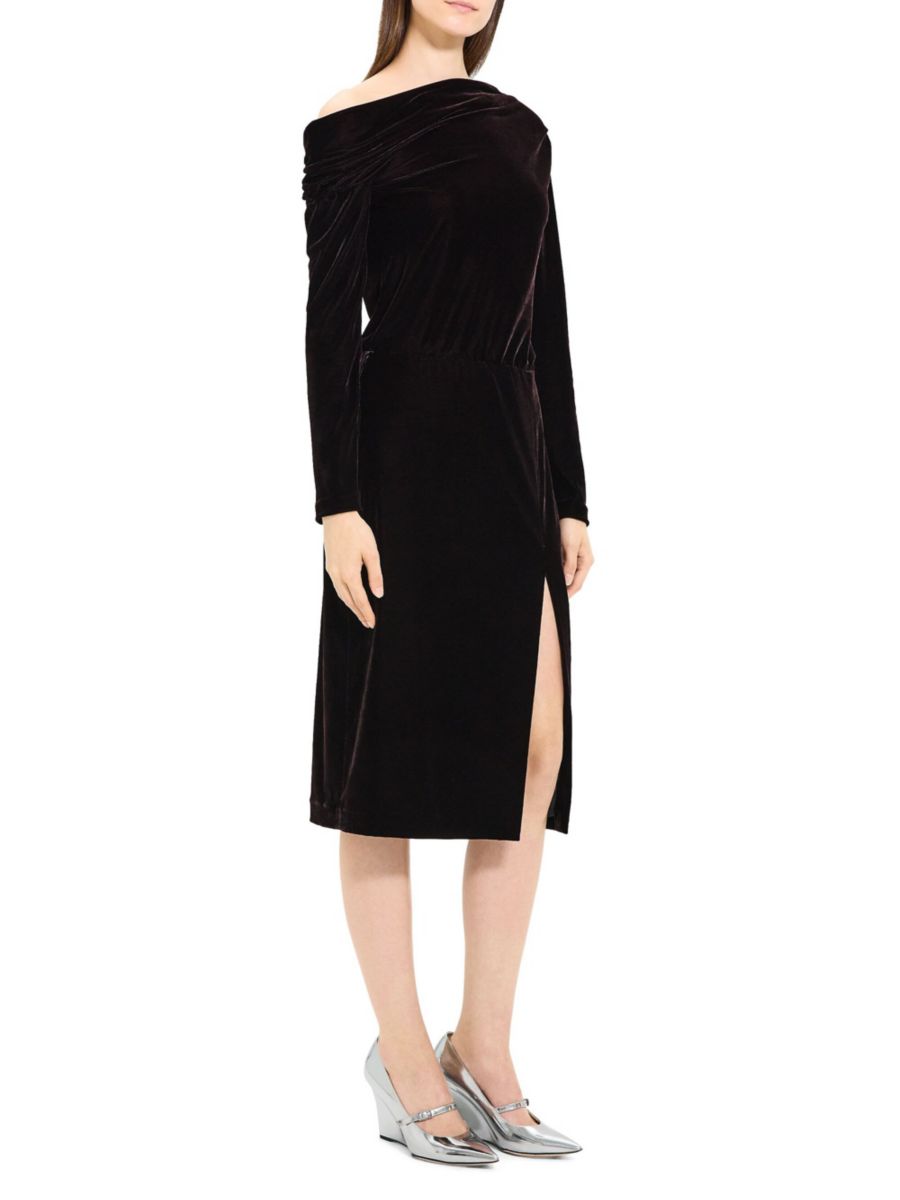 Платье миди с открытыми плечами от Theory выполнено из мягкого бархата и дополнено разрезом до бедра спереди.