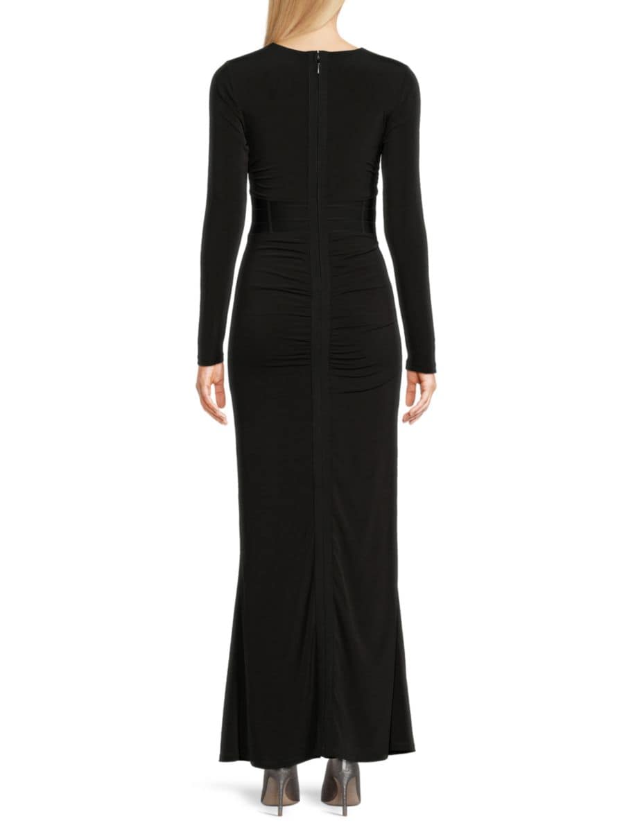 Это платье Hervé Léger элегантно скроено с разрезом спереди и облегающим силуэтом длиной до пола, что создает элегантный, изысканный дизайн.