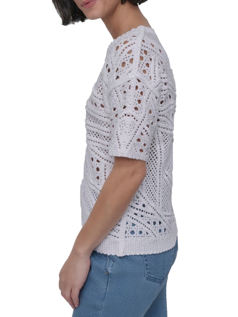 Этот свитер ажурной вязки выполнен из лёгкой, дышащей ткани с рыхлым узором. Свободный крой и слегка прозрачная текстура придают изделию лёгкую глубину.