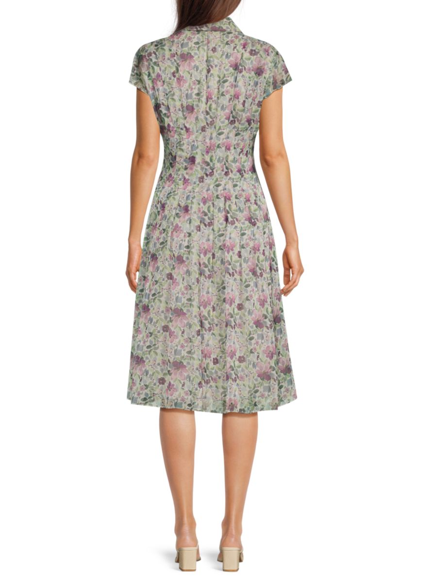 Это платье-рубашка Mikael Aghal выполнено из эластичной ткани с сиреневым цветочным принтом, структурированным заостренным воротником и изящной плиссировкой, создающей изысканный образ.