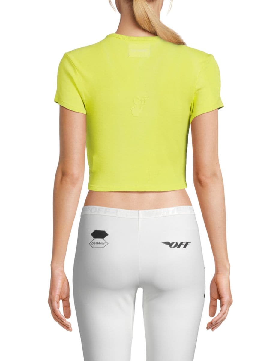 Укороченный топ Off-White с ребристым логотипом выполнен из мягкой хлопковой смеси. Он имеет круглый вырез горловины, короткие рукава и тисненый логотип. Завязка спереди добавляет элегантности этому приталенному фасону.