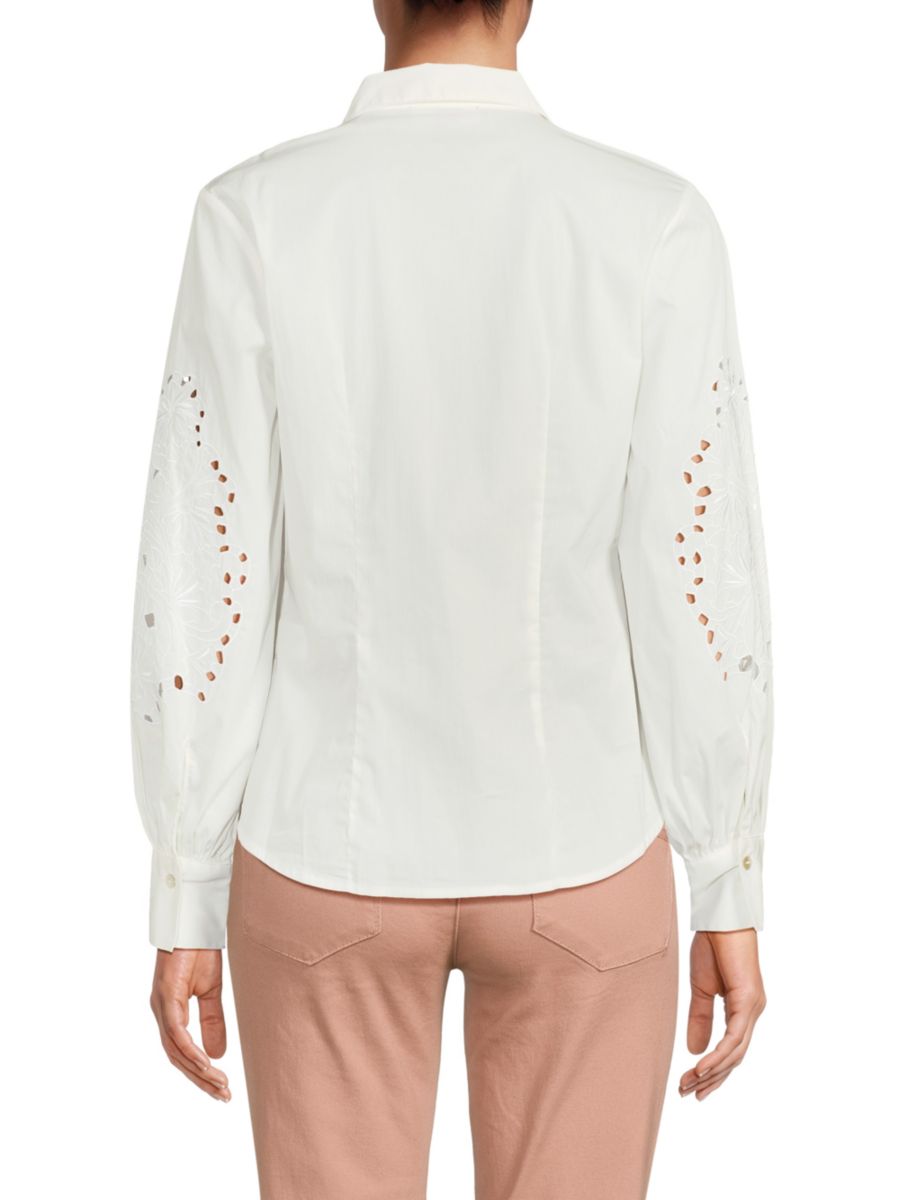 Эта рубашка T Tahari изготовлена из хлопковой смеси с вышивкой шиффли на рукавах.