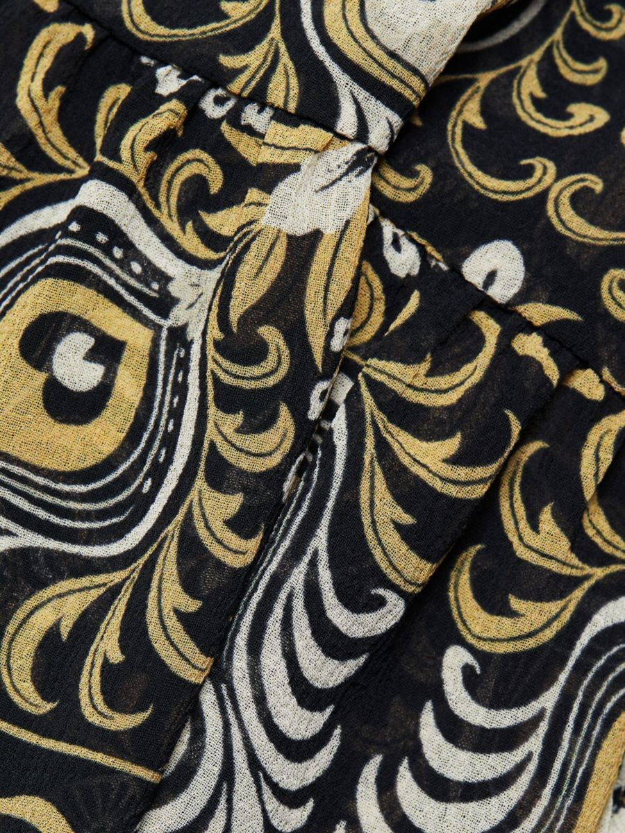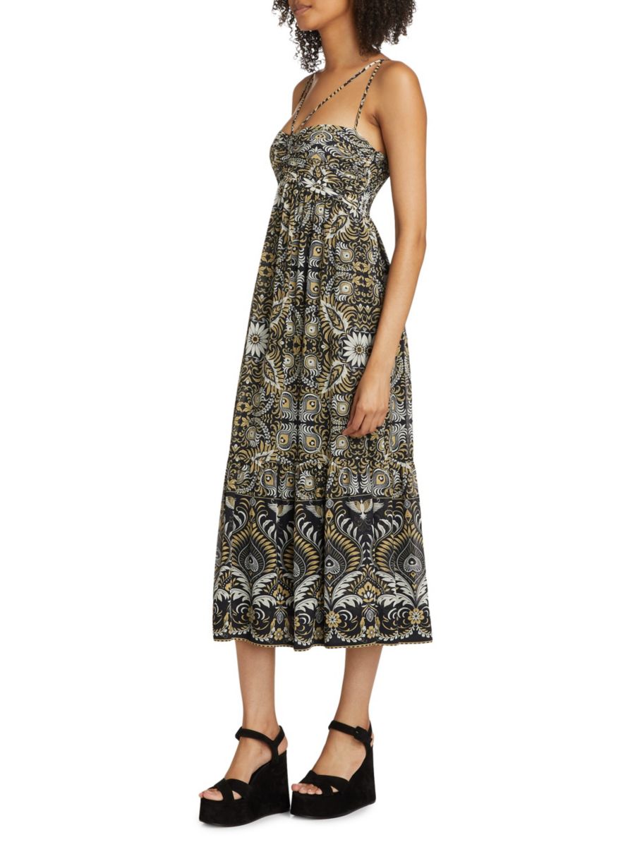 Платье миди Arya от Kobi Halperin отличается классическим А-силуэтом и фирменным принтом Odyssey. Это изделие с американской проймой и присборенным лифом.