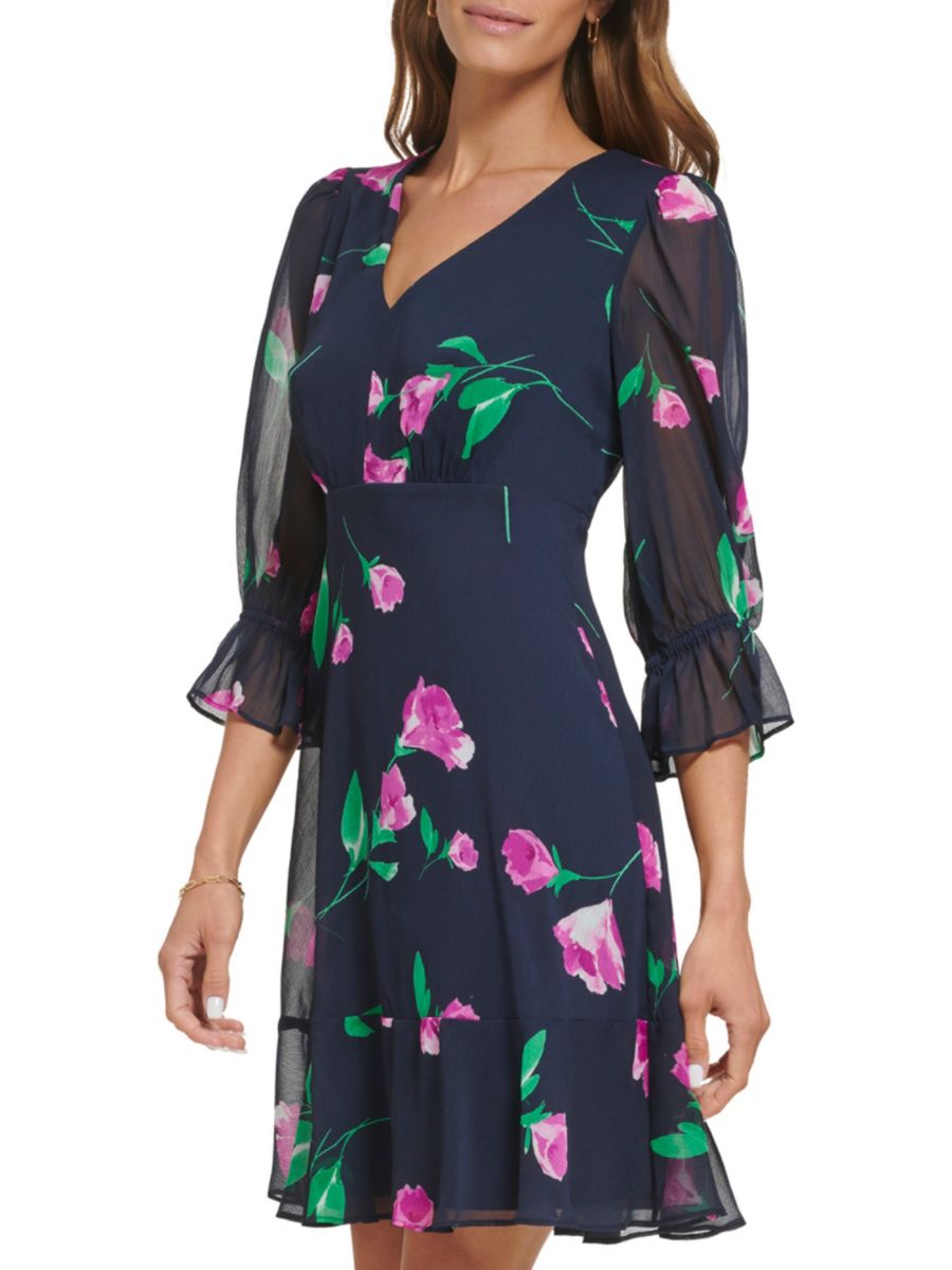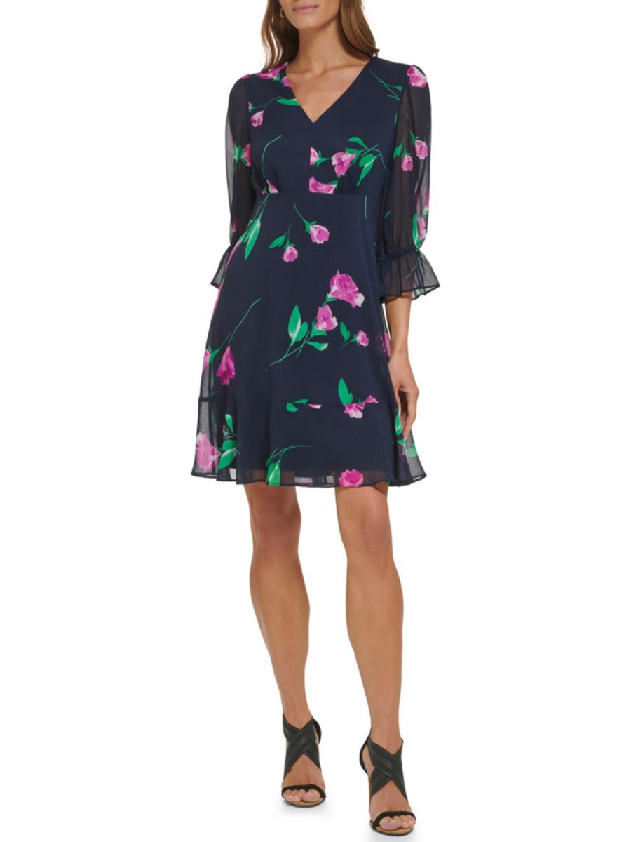 Это мини-платье DKNY с цветочным узором и рукавами-фонариками. Структурированный силуэт создаёт изысканный образ.