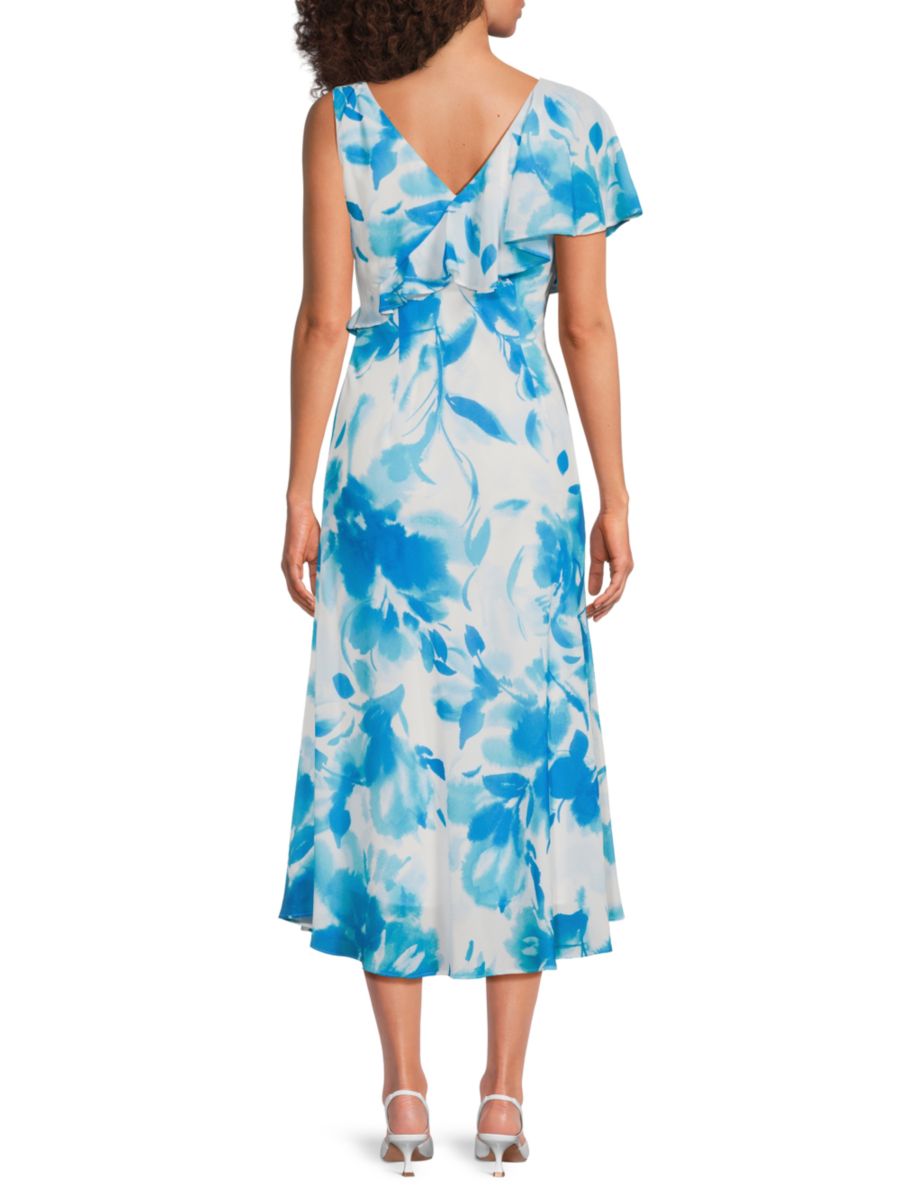 Платье миди с цветочным асимметричным рюшами Halston, цвет Blue White
