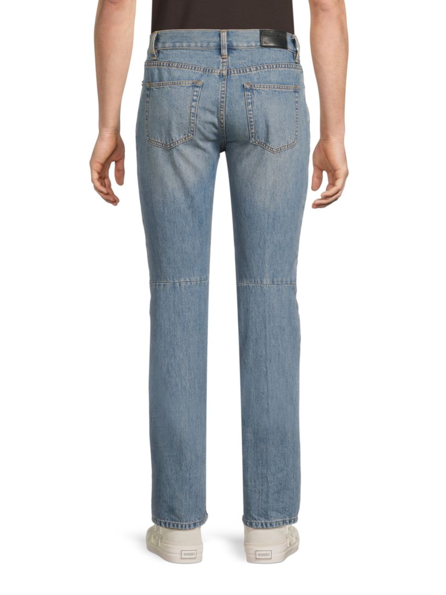 Джинсы Moto-Worker от Helmut Lang сшиты из хлопкового денима с потертостями. Пять карманов, застёжка на пуговицы и молния дополняют структурированный силуэт.