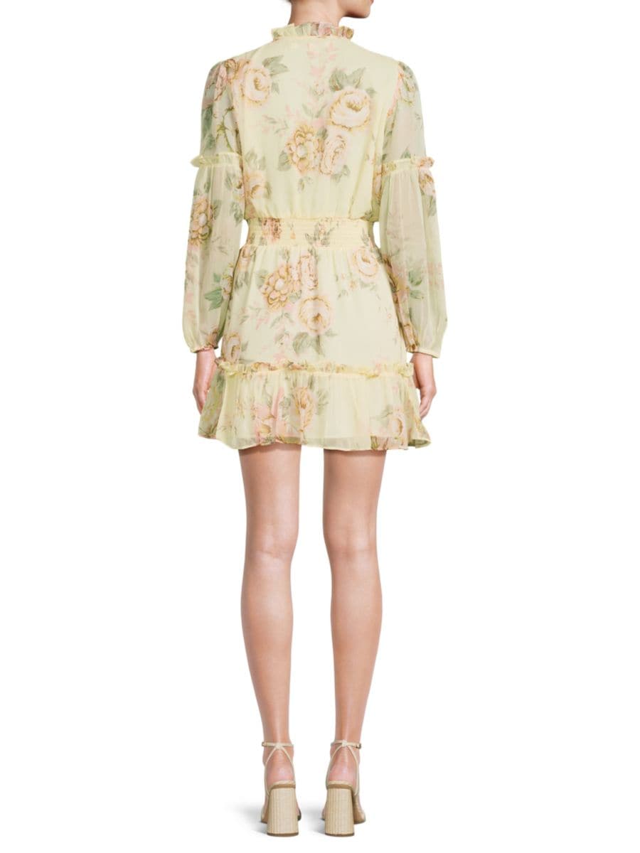 Мини-платье Darlene от Walter Baker отличается нежным цветочным принтом на воздушной ткани, романтичными оборками, присборенной талией и вырезом-замочной скважиной. Изящная сборка и длинные рукава придают воздушное очарование.