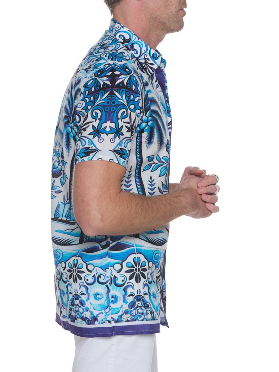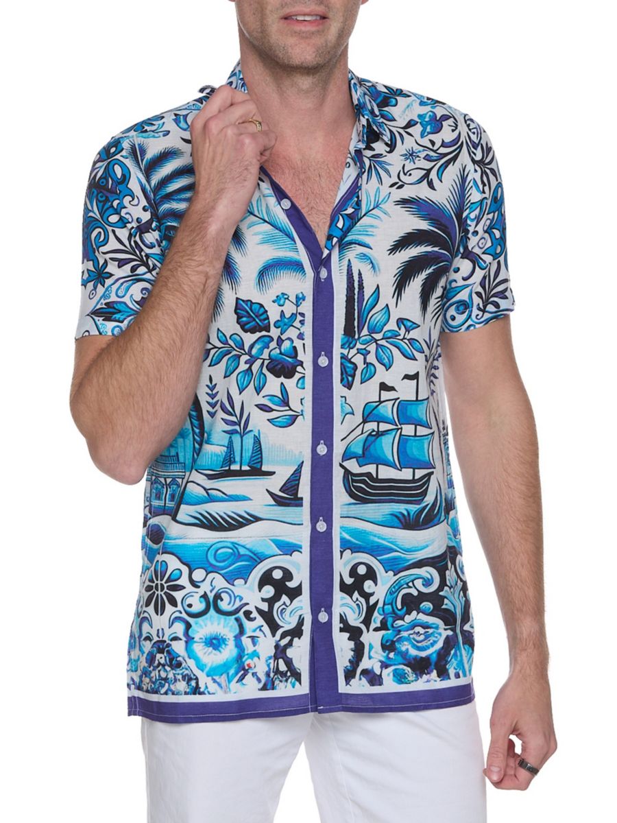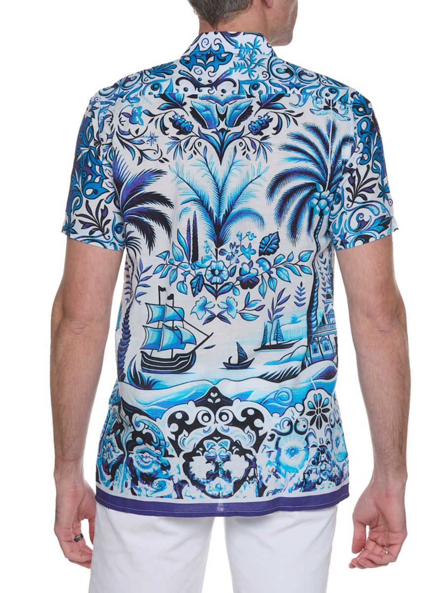 Ranee's представляет рубашку Sail Away приталенного кроя из дышащей смеси льна и хлопка. Эта лёгкая модель с классическим воротником и короткими рукавами добавит комфорта и структуры образу для тёплой погоды.