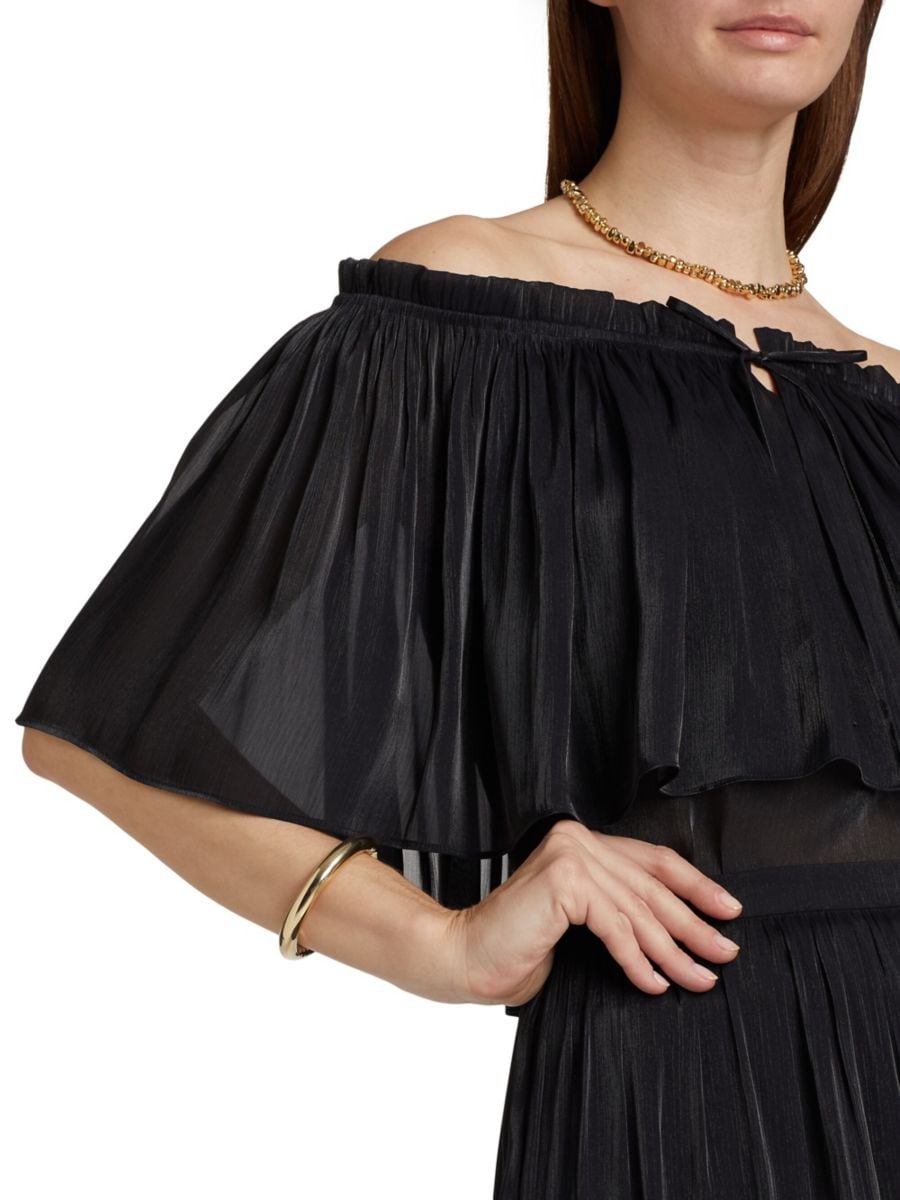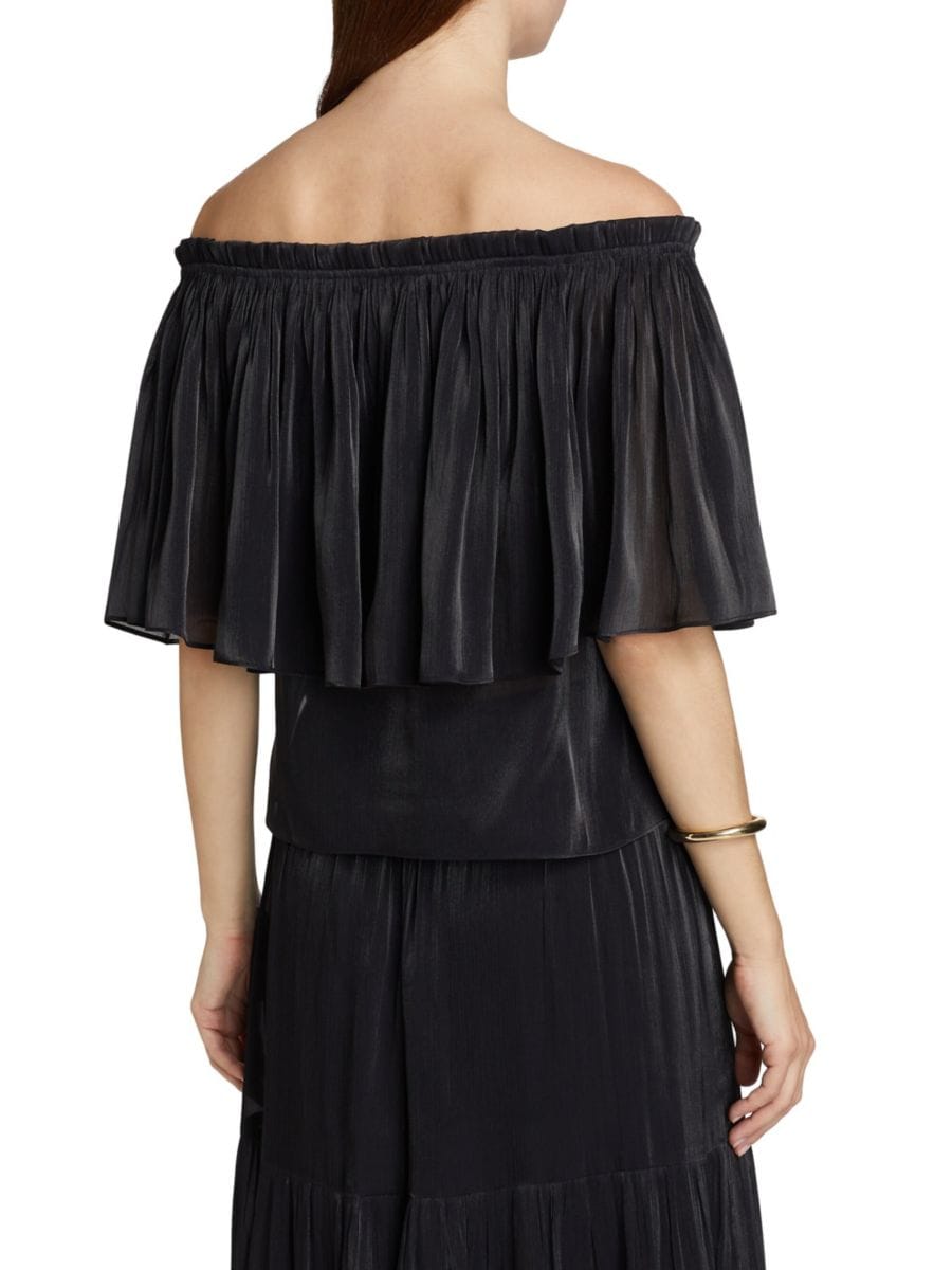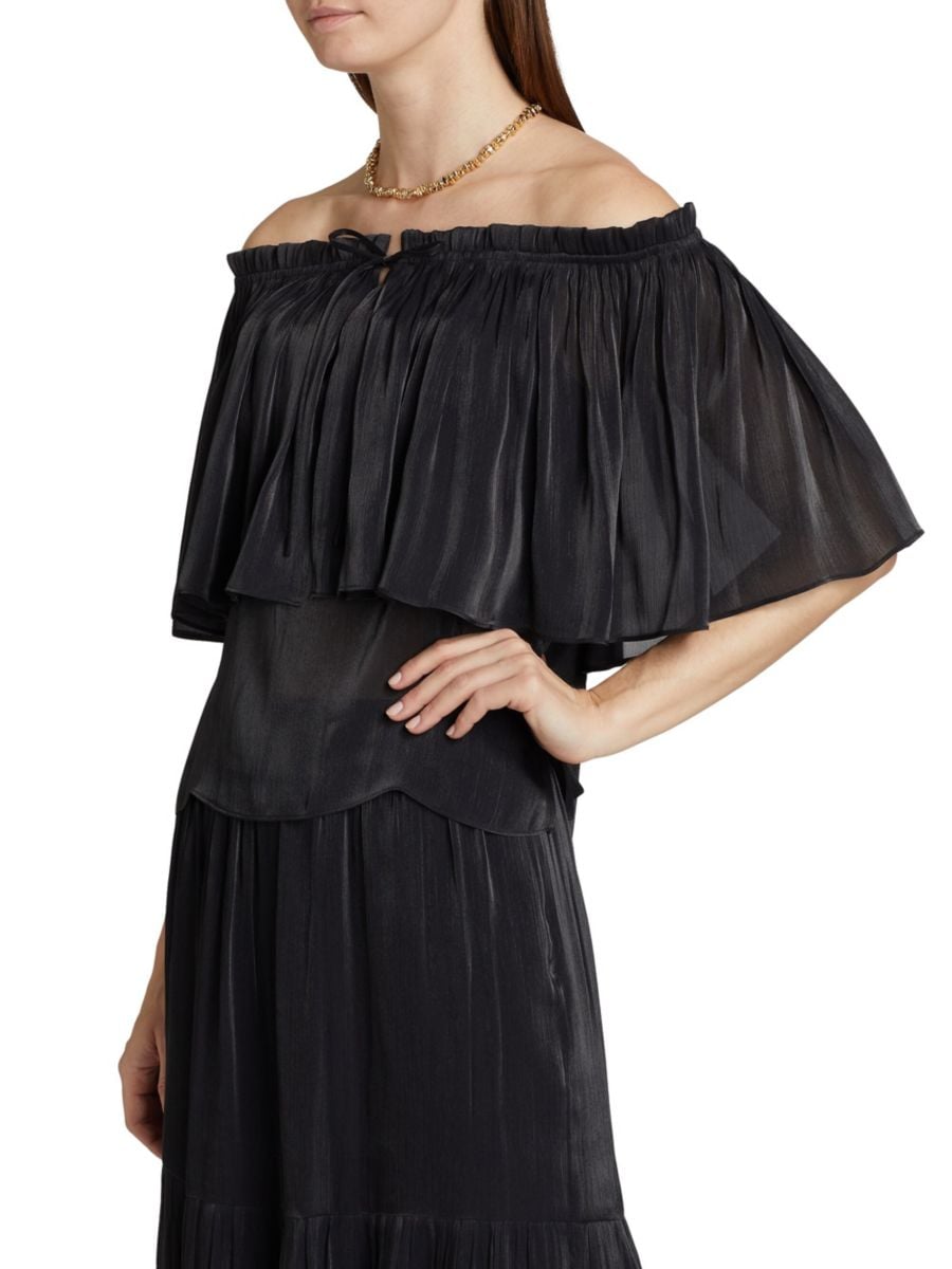 Блузка Mads от Kobi Halperin с облегающим лифом и открытыми плечами, завязывающимися на завязке. Верхний слой с воланом завершает образ.