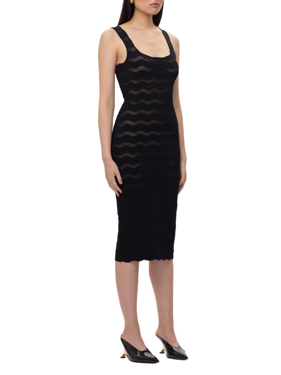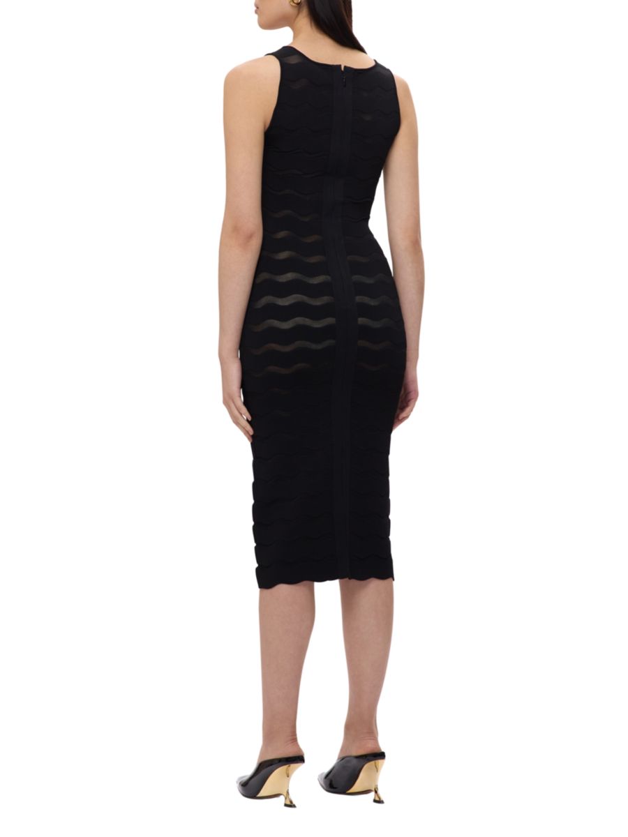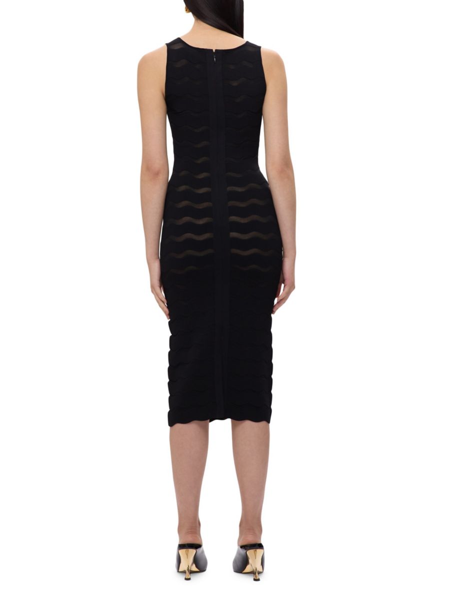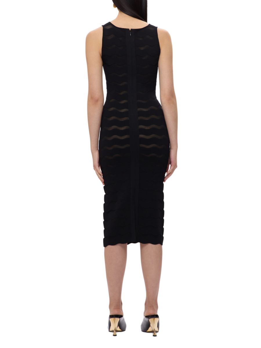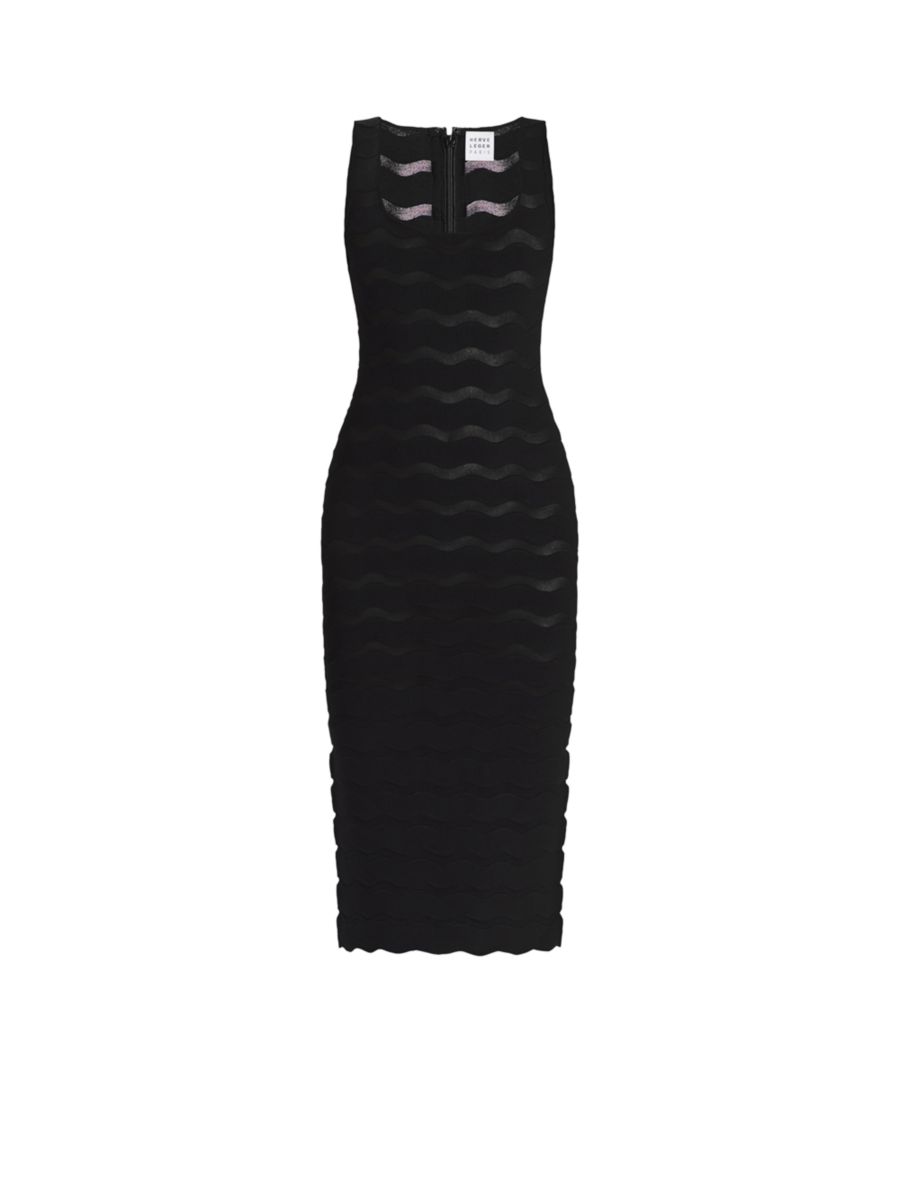 Платье-футляр The Gwynn от Hervé Léger имеет нейтральный нижний слой, создающий эффект прозрачности. Облегающая миди-юбка с фестончатым дизайном дополнена разрезом сзади и молнией по центру спины.