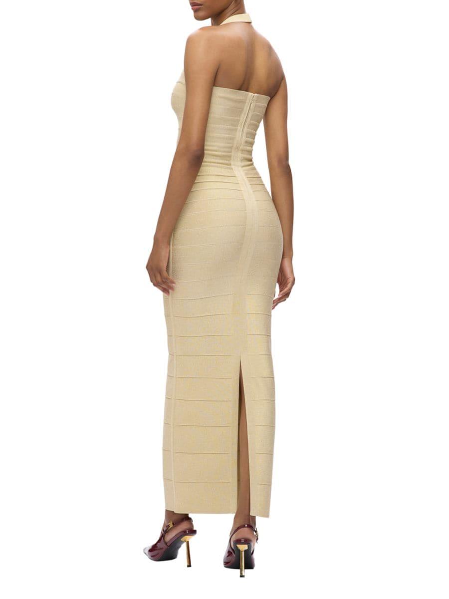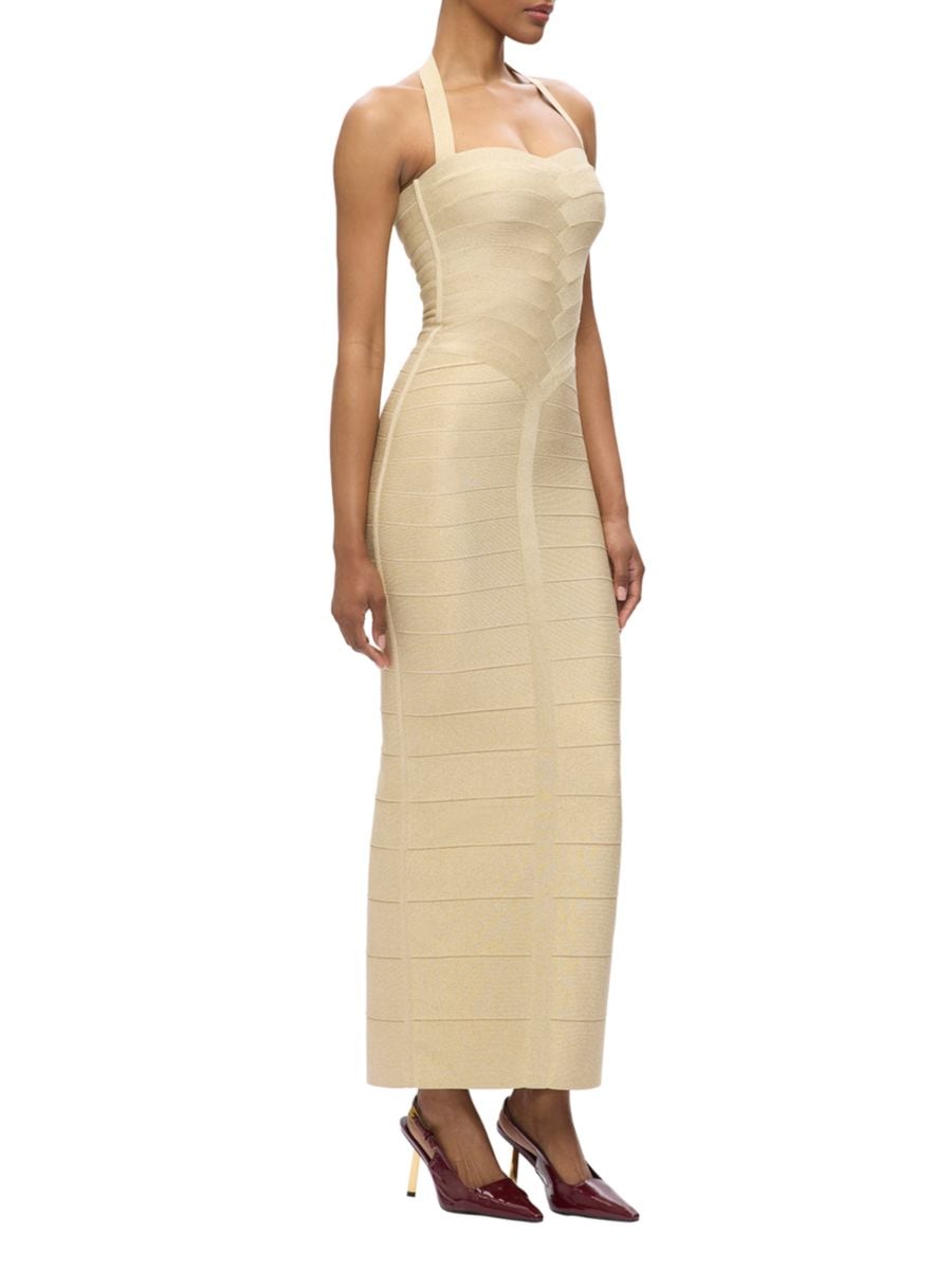 Платье Iris от Hervé Léger с квадратным вырезом-халтер, перекрещивающимися деталями на спине и разрезом по центру. Изделие выполнено из фирменного бандажа, который скульптурирует и сглаживает фигуру, а боковые вставки обеспечивают дополнительную поддержку и дополнены металлизированным эффектом.