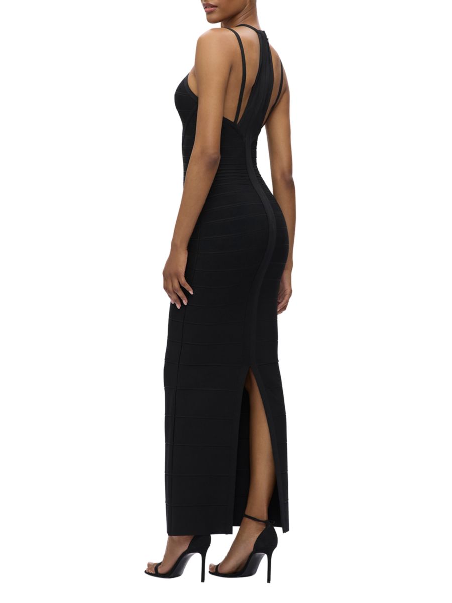 Бандажное платье Hervé Léger Lana отличается вырезом-иллюминацией с прозрачной V-образной отделкой и отделкой бретельками, что создает элегантный, скульптурный силуэт.