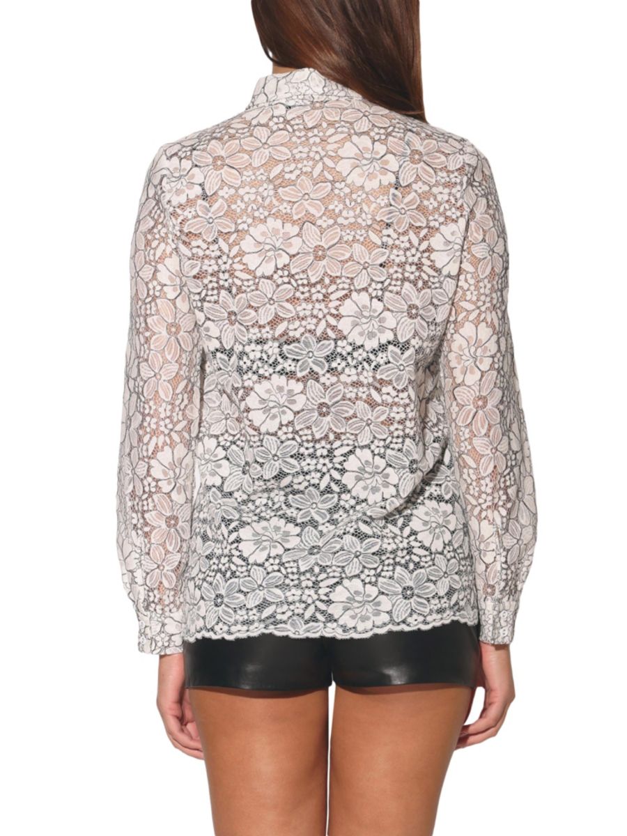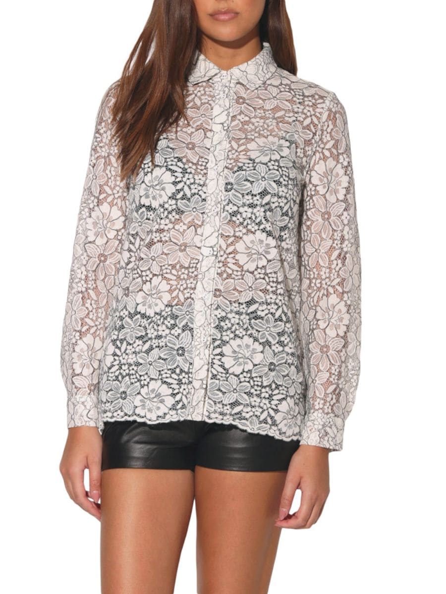 Рубашка Maxine от Walter Baker выполнена из прозрачного цветочного кружева, имеет свободный крой и классический воротник. Длинные рукава с манжетами на пуговицах и застежка на пуговицы спереди завершают силуэт без подкладки.