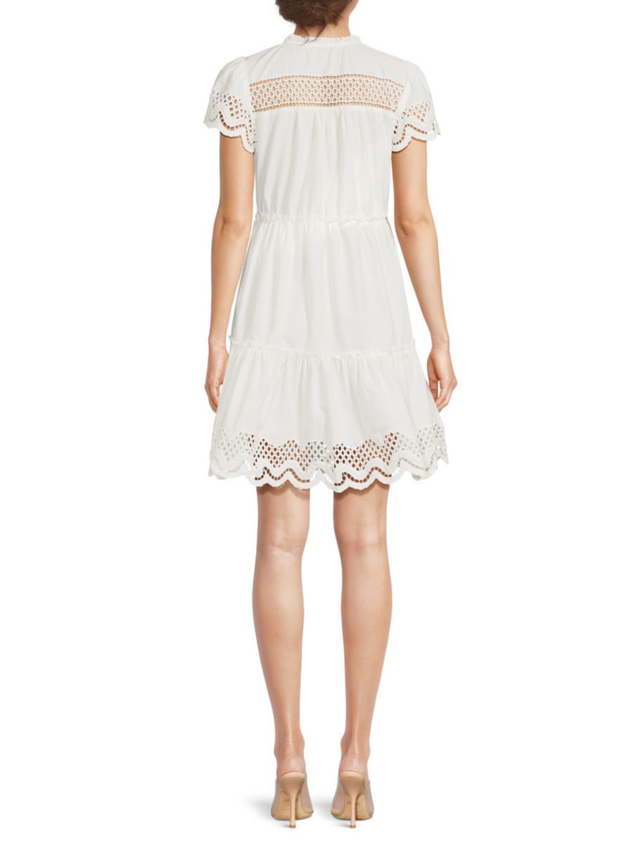 Вышивка лесенкой в виде ажурного шва обрамляет это хлопковое мини-платье от Rails с фестончатыми краями и присборенной заниженной талией для создания воздушной структуры.