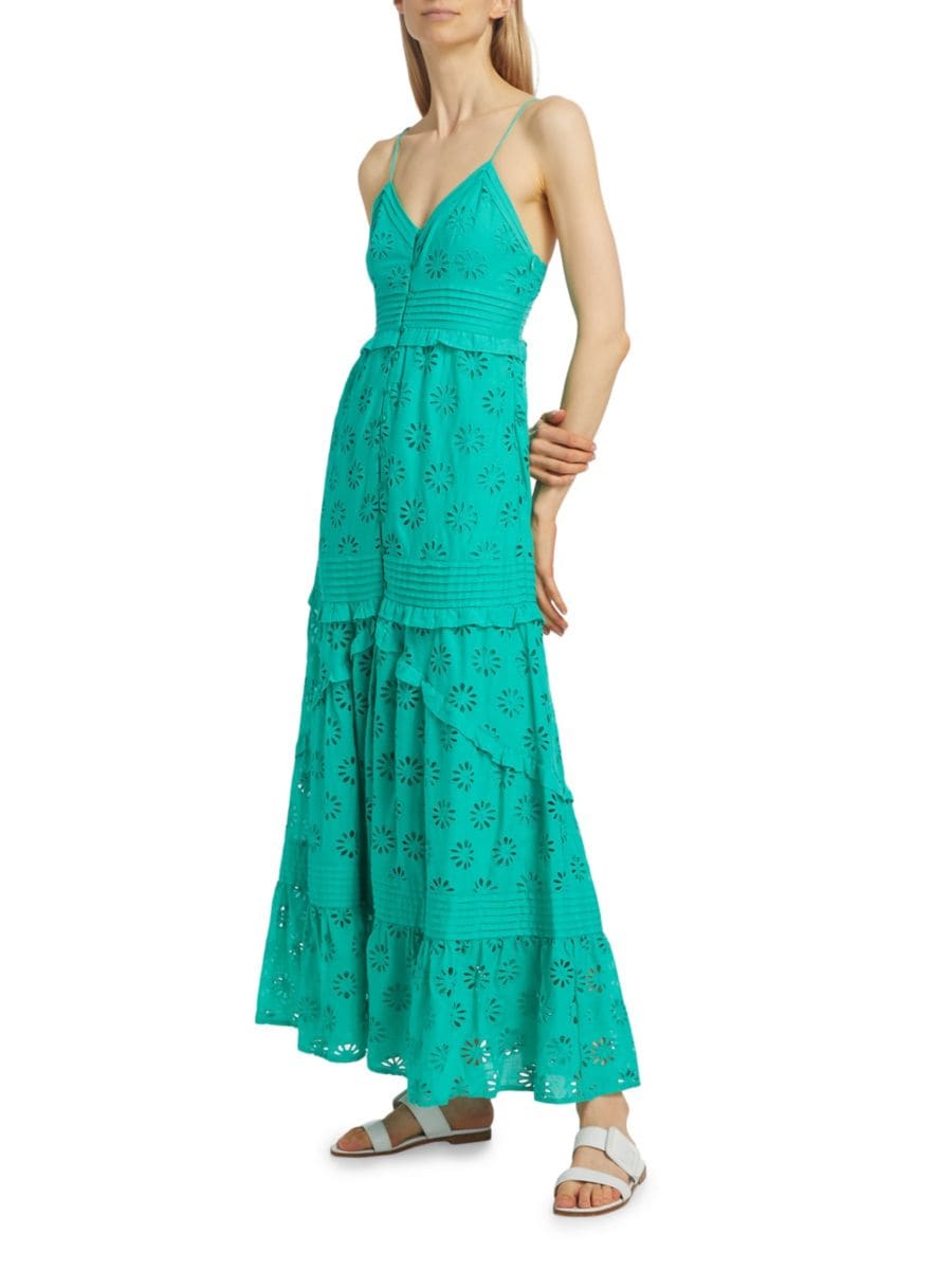 Платье макси Henrietta от Rails, выполненное из хлопкового кружева с ажурным узором, имеет V-образный вырез, тонкие бретельки и многоярусную юбку.