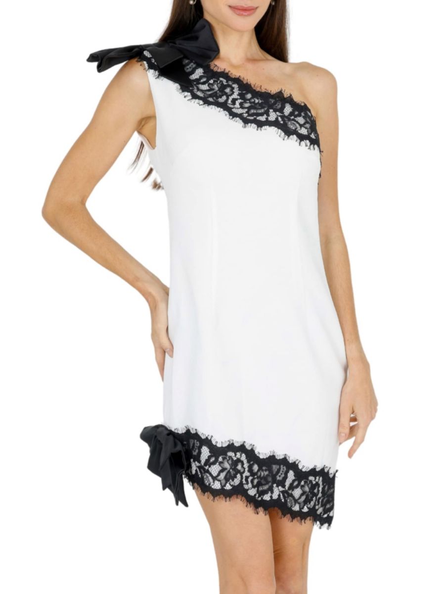 Мини-платье Zeena от AKALIA на одно плечо выполнено из легкой структурированной ткани и украшено драпированным бантом и отделкой из кружева с ресничками.