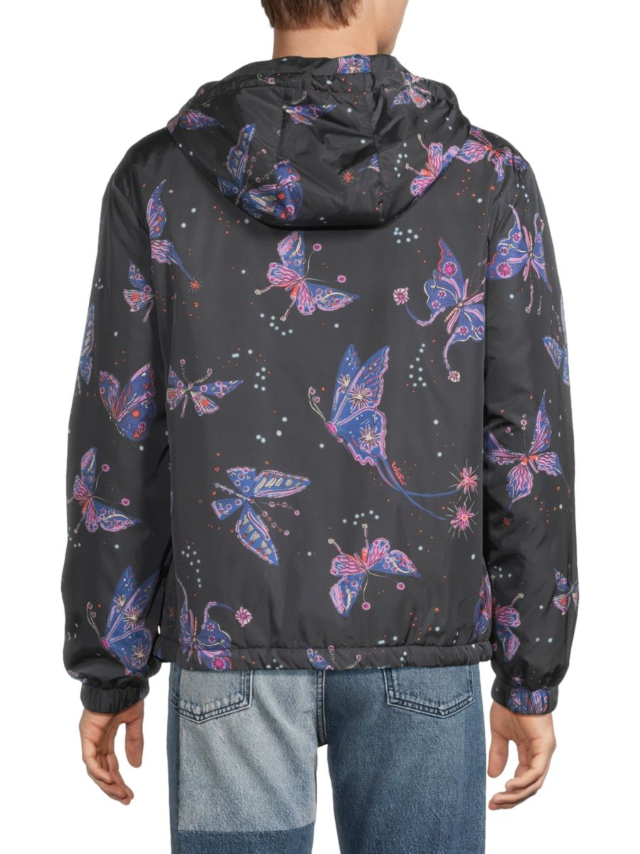 Эта куртка с принтом бабочек от Valentino выполнена из лёгкого полиэстера с застёжкой-молнией спереди и имеет свободный крой. Капюшон на шнурке и эластичная отделка придают романтическому образу практичность.