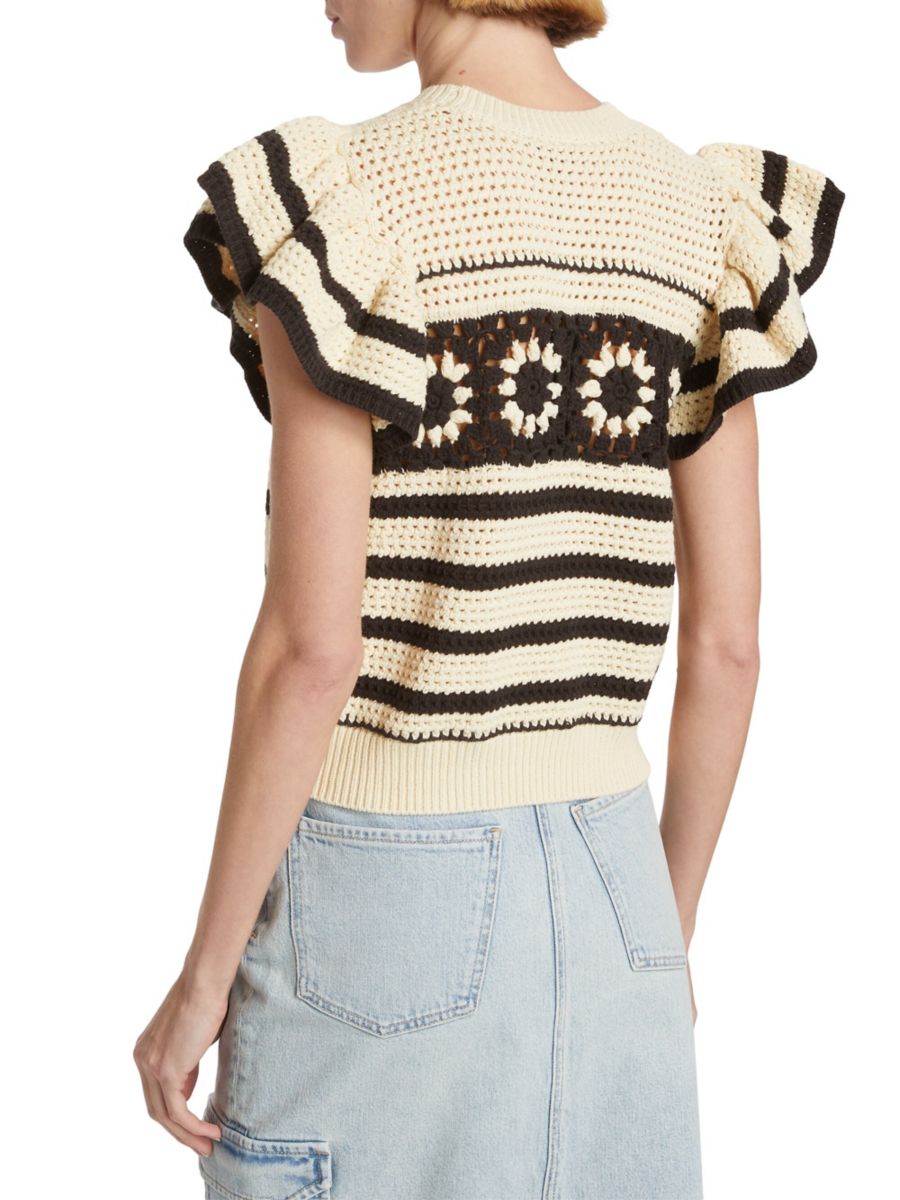 Топ Penelope от Rails, связанный крючком из легкой хлопковой смеси, украшен цветочным и полосатым мотивом, обрамленным рукавами-крылышками.