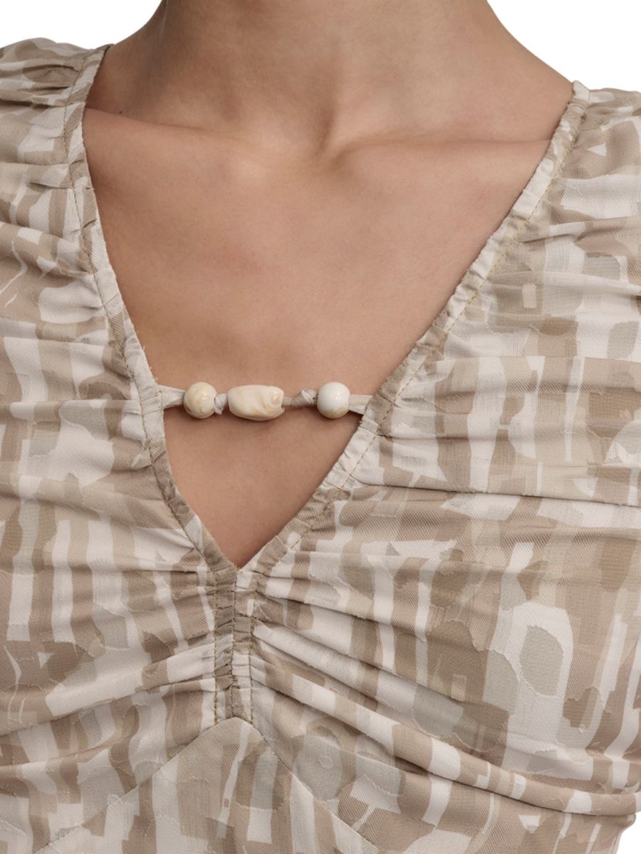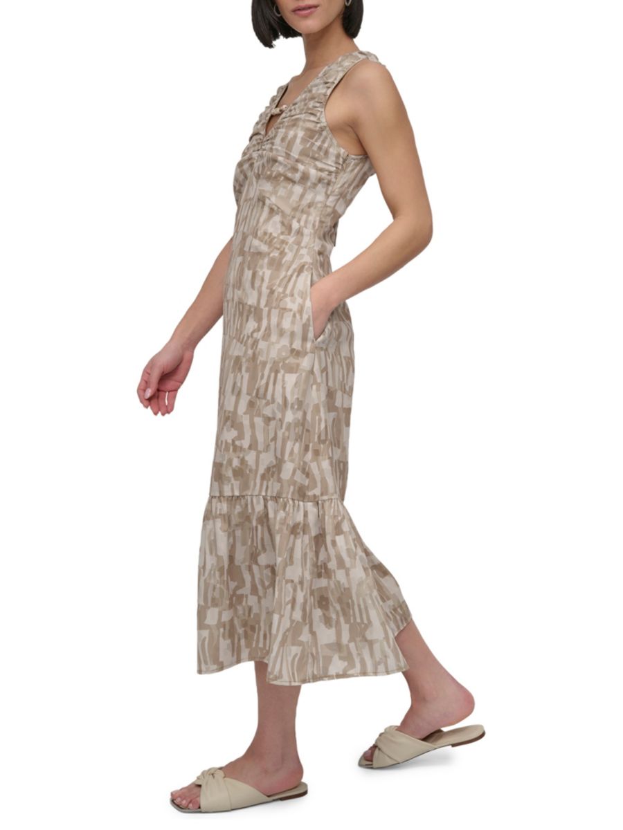 Это платье миди без рукавов из коллекции DKNY Лето 25 выполнено из прозрачного шифона с принтом. Собранный V-образный вырез, украшенный отделкой бисером, и завязка на спине завершают воздушный силуэт.