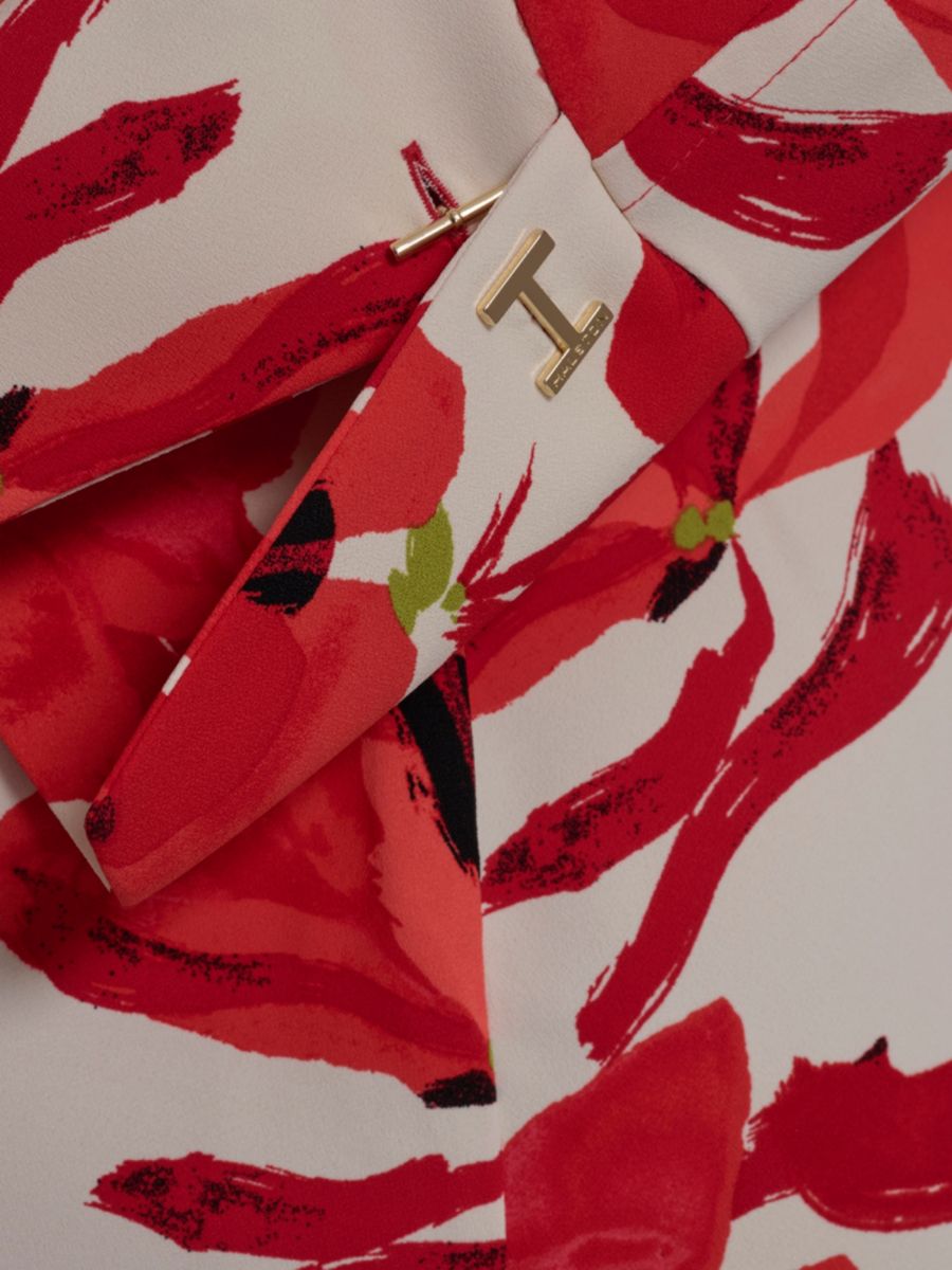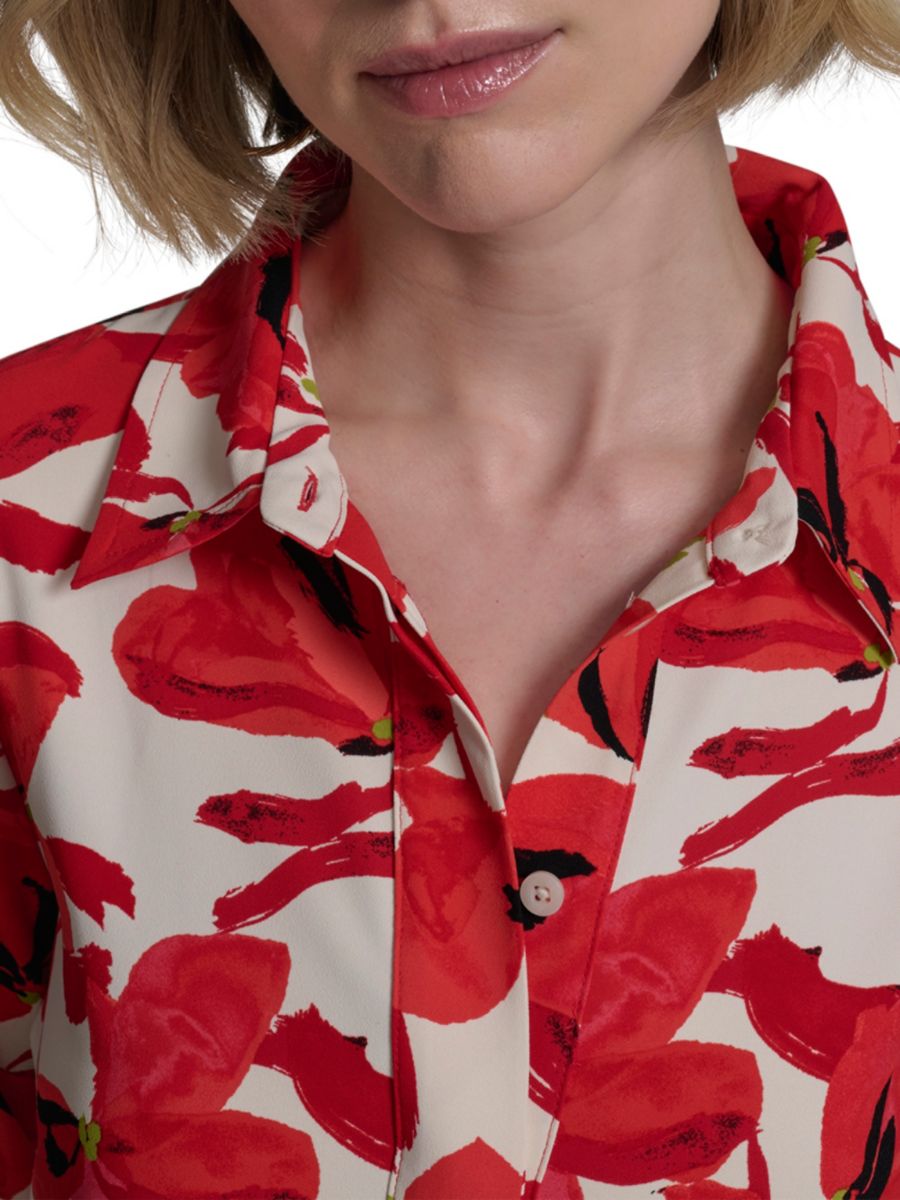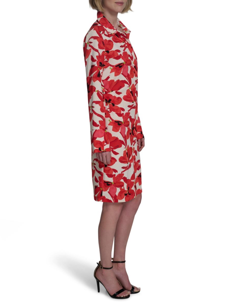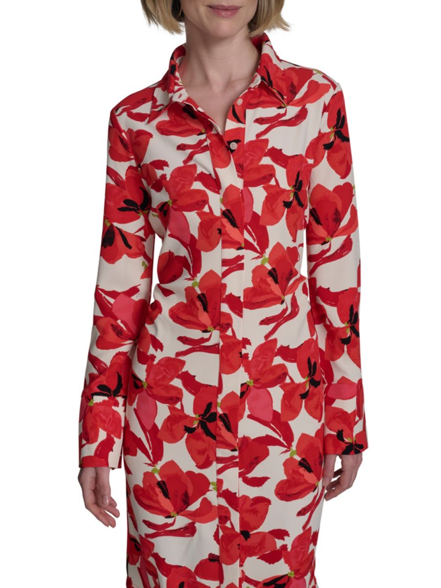 Яркие цветочные узоры в ярких красных тонах придают этому креповому платью-рубашке миди от Halston живописную элегантность. Платье с острым воротником и длинными рукавами дополнено элегантной застежкой на пуговицы спереди и изящным золотистым логотипом на манжете.