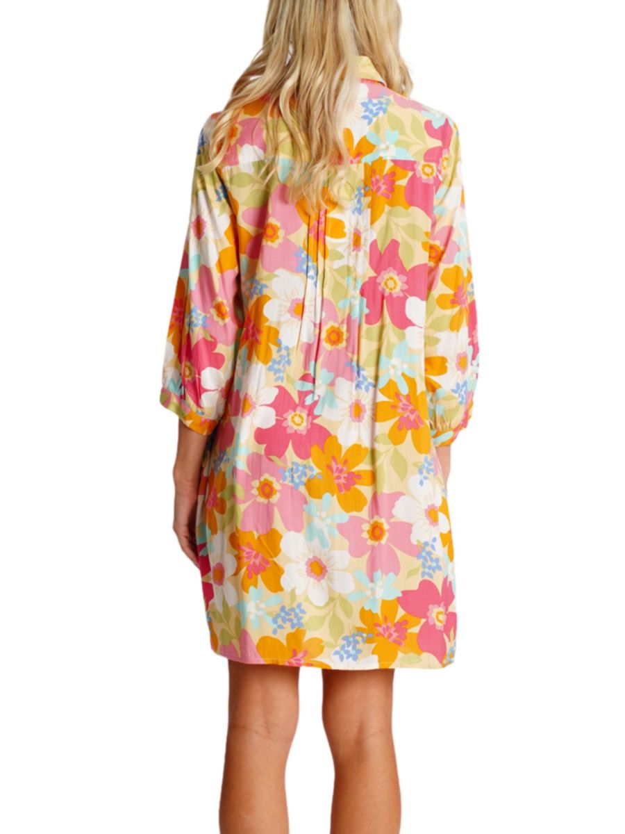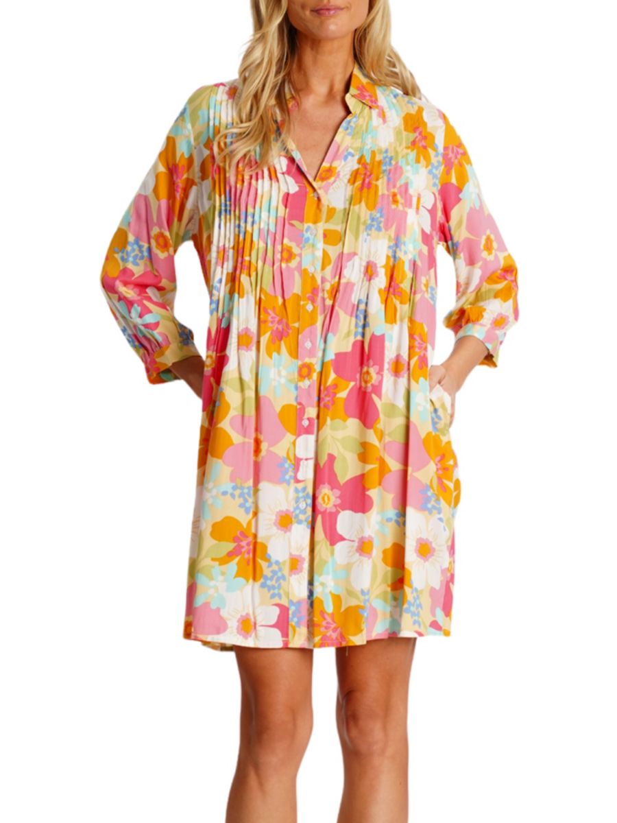 Это хлопковое пляжное платье от La Moda Clothing украшено ярким цветочным принтом и четкими складками на лифе. Платье выполнено в легком А-образном силуэте с рукавами три четверти и застежкой на пуговицы.