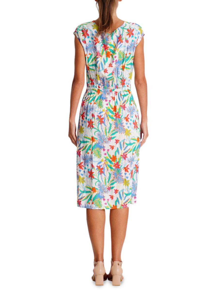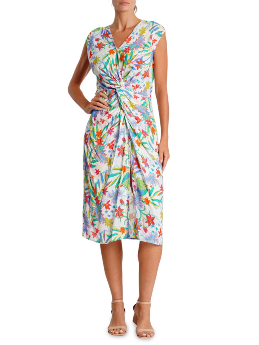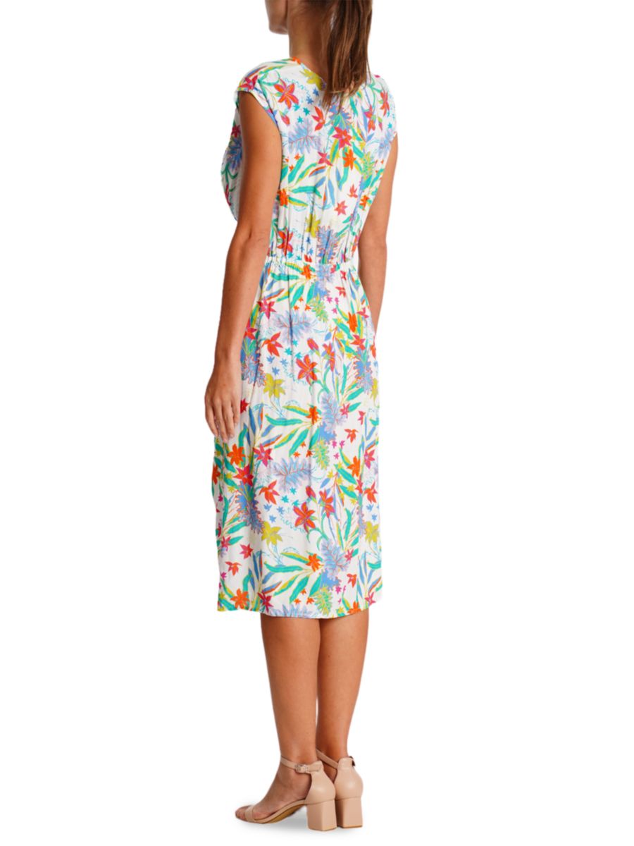 Это тканое вискозное платье от La Moda Clothing украшено ярким тропическим цветочным принтом и рюшами спереди. Длина миди, без рукавов, обеспечивает красивую драпировку и женственную непринужденность.