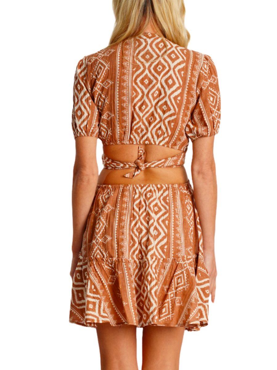 Это пляжное платье от La Moda Clothing с геометрическим рисунком и расклешенной оборкой по подолу. Боковые вырезы подчеркивают линию талии под присборенным бюстом, придавая контуры игривому силуэту с короткими рукавами.