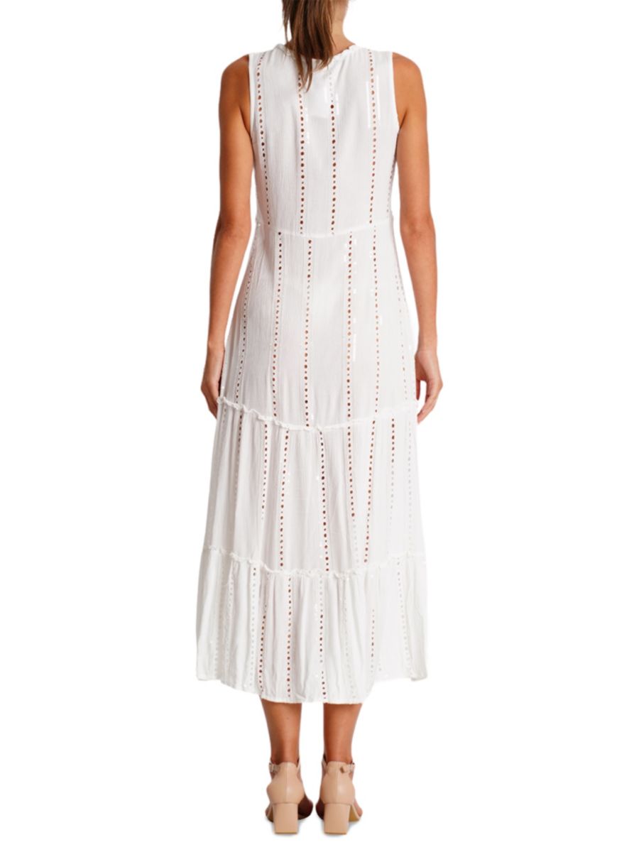 Это длинное платье-туника от La Moda Clothing выполнено из воздушного вискозного шёлка с вертикальной вышивкой люверсами, что создаёт лёгкий и женственный образ. Безрукавный силуэт и присборенные швы создают ощущение лёгкости и движения.